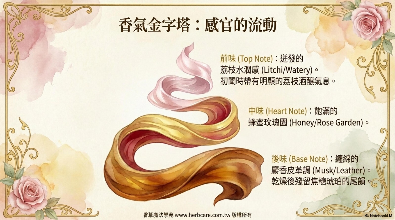 | 主成分 | 苯乙醇(60-75%)、香茅醇(15-20%)、橙花醇、獨特「麝香玫瑰酮」成分造就性感尾韻 |