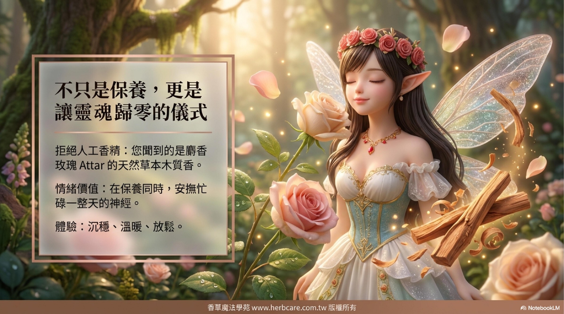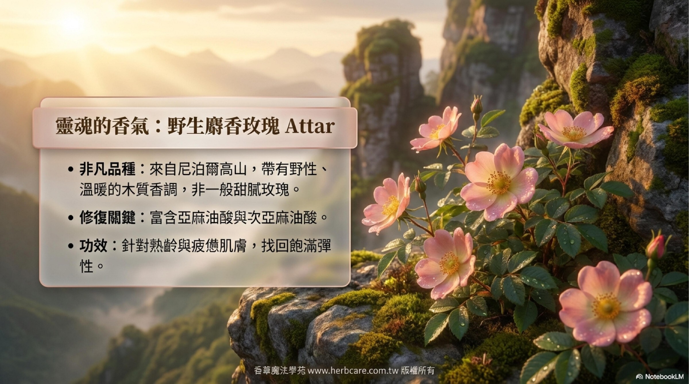護膚價值:麝香玫瑰富含特殊的脂肪酸(亞麻油酸、次亞麻油酸),是肌膚屏障的重要營養素。它能針對熟齡或疲憊肌膚提供極佳的滋潤與撫紋效果,幫助肌膚找回原本的飽滿彈性。