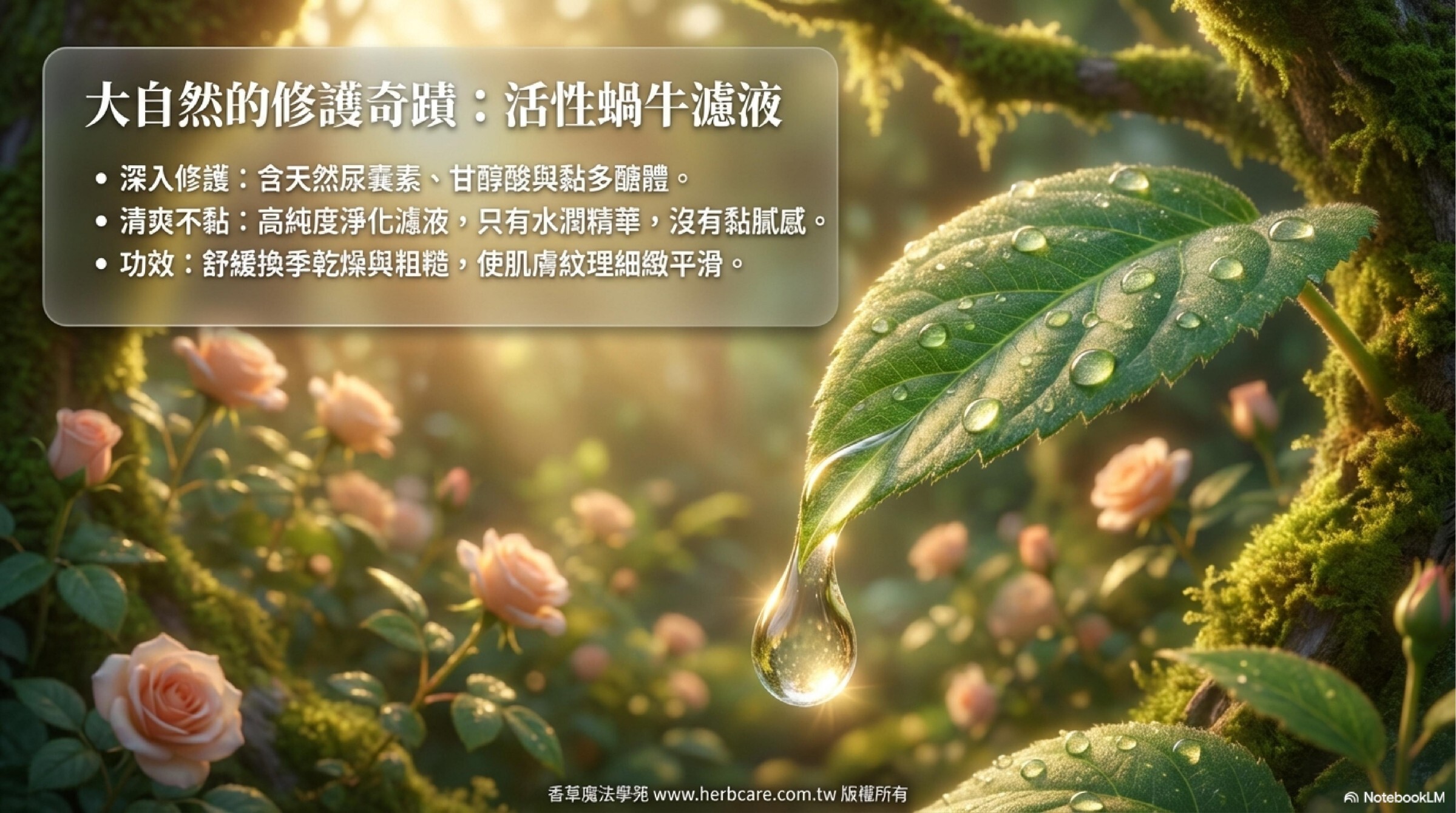 這是現代保養科學中最令人驚豔的成分之一。蝸牛為了在粗糙的地面爬行而不受傷,其分泌液中含有天然的尿囊素、甘醇酸與黏多醣體。