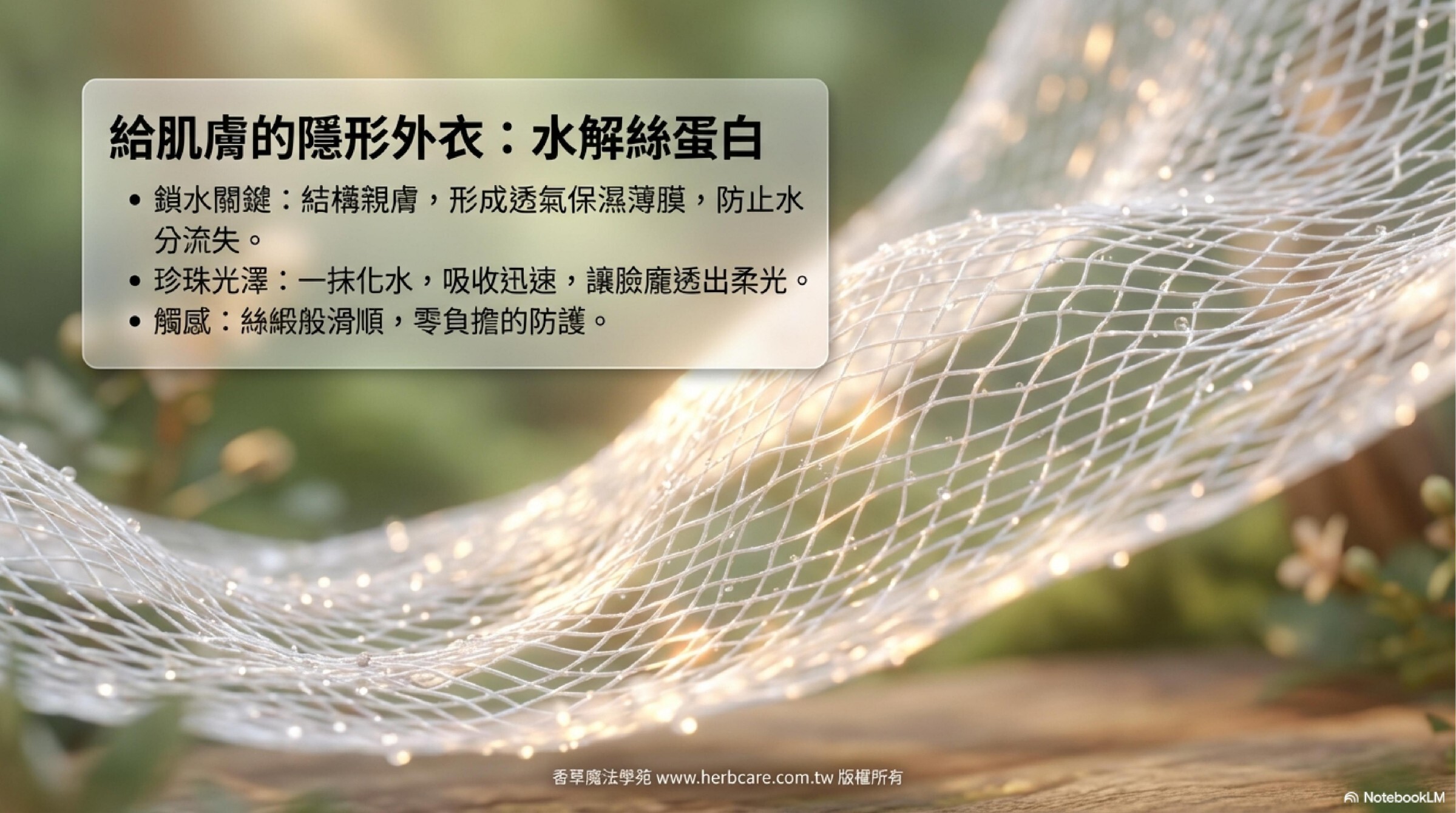 親膚鎖水:絲蛋白的結構與人體肌膚極為相似,親膚性極高。它能像海綿一樣吸附水分,並在肌膚表面形成一層透氣的保濕薄膜,有效鎖住精華成分,防止水分流失,讓臉龐整日透出自然的珍珠光澤。