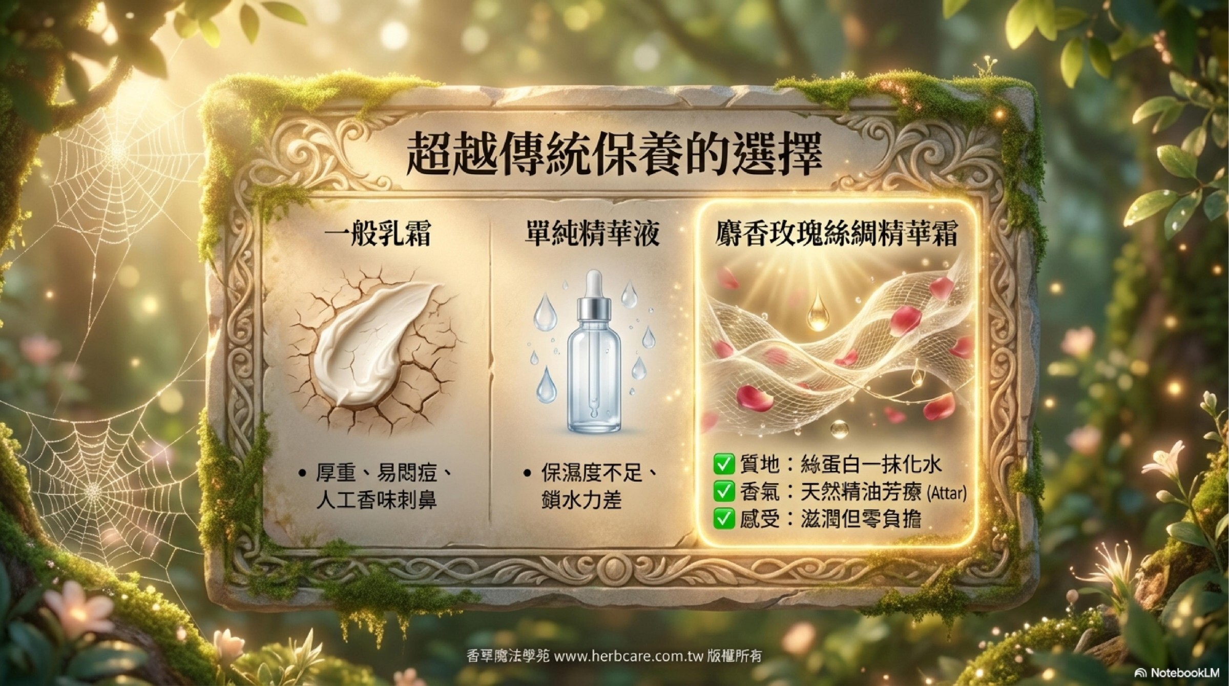 市面上的保養品成千上萬,為什麼我們堅持將麝香玫瑰、蝸牛液與絲蛋白結合在一起?因為我們發現,肌膚要的不只是「油」或「水」,而是需要一套完整的「滋養—修護—封存」機制。