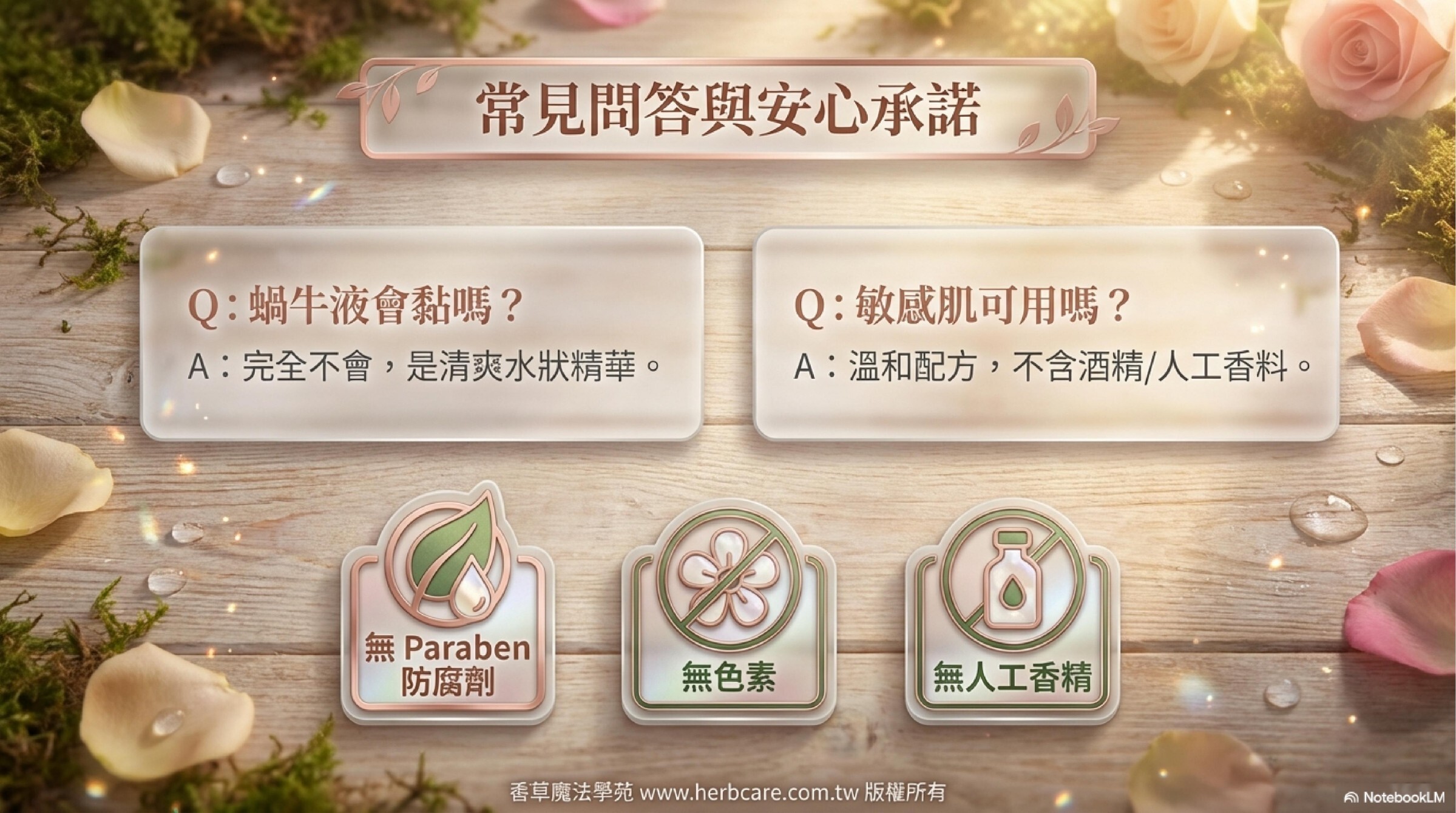 A:完全不會!我們使用的是高純度淨化的「蝸牛分泌濾液」,它是清爽的水狀精華,沒有黏液的黏膩感,也沒有任何腥味。您只會聞到麝香玫瑰的天然精油香氣。
