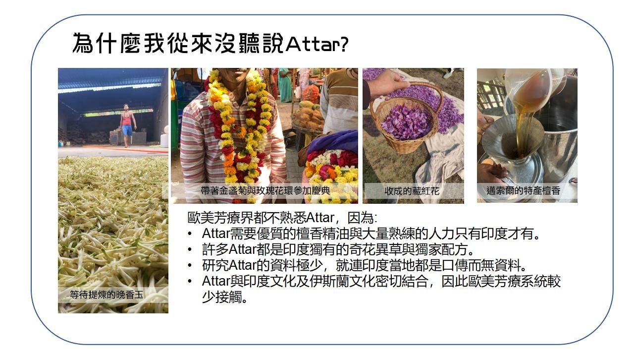 對原產地印度及主要使用市場伊斯蘭國家來說,香水也是一種藥,是針對身心靈各方面都有作用的,所以一開始我們就把香水與靈藥當作阿塔的定義。