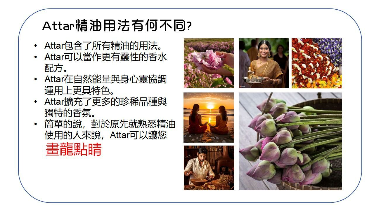 Attar精油的特點就是香味非常明顯且持續,且還跟某些香水的香味很像,甚至在我們的研究與採購的過程中,的確發現很多香精冒充是Attar精油,那Attar跟香精有什麼差異呢?