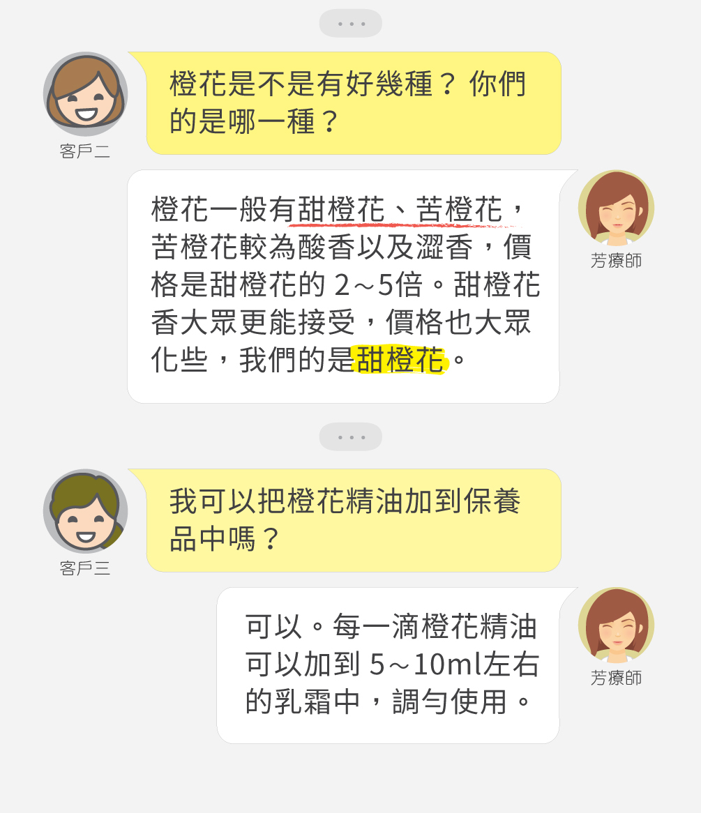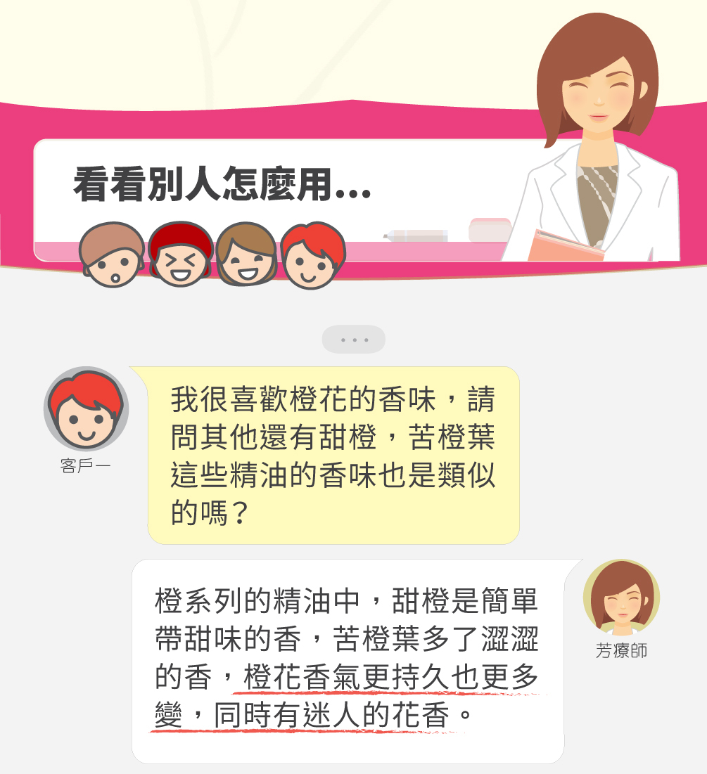 | A2: 沒錯!橙花精油的香氣具有溫和的安撫、鎮靜作用,能幫助你舒緩焦慮、緊張的情緒,進而營造一個適合入睡的環境。你可以在睡前用它來擴香或進行輕柔的按摩,幫助你放鬆身心,更容易進入夢鄉。 |