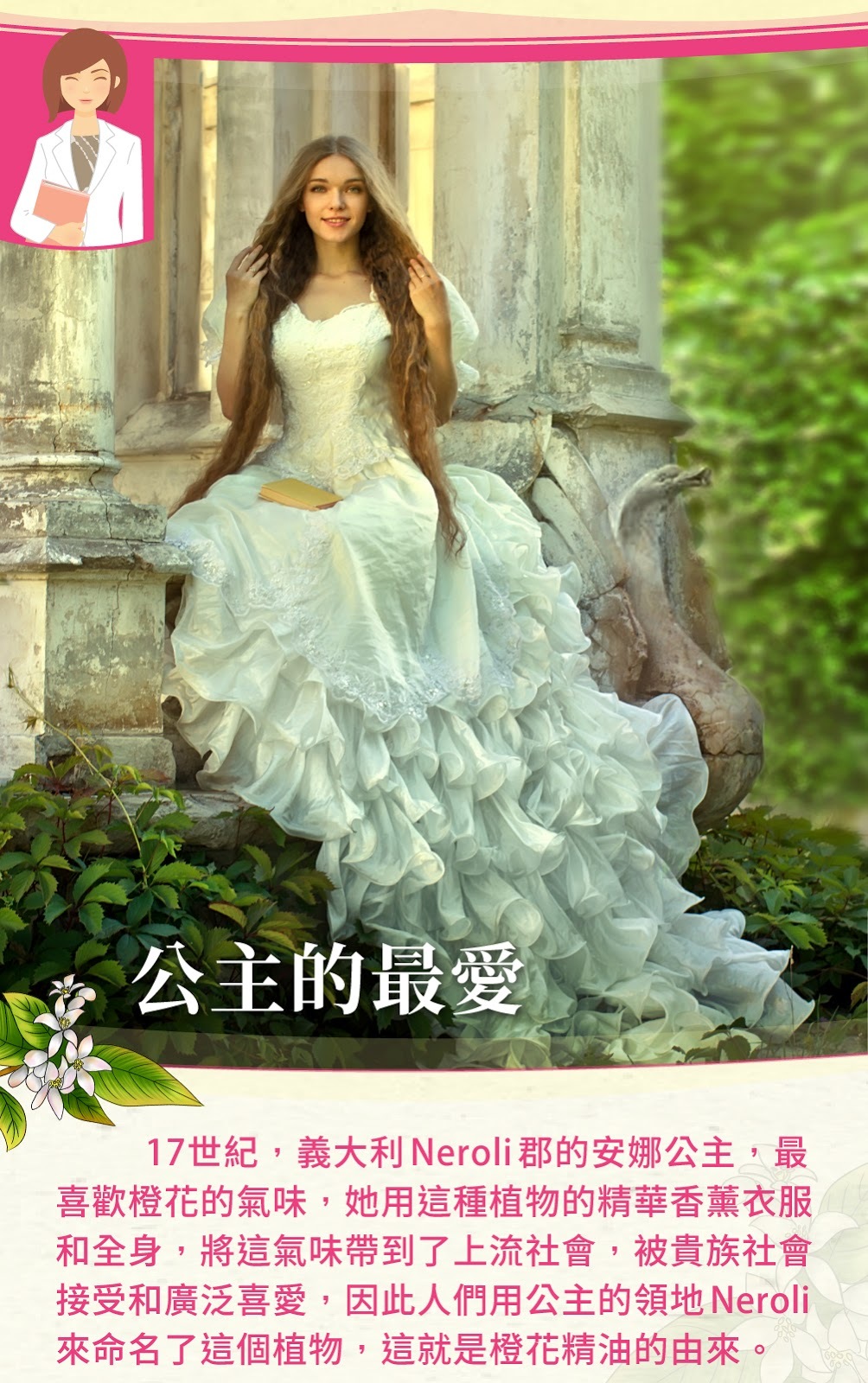 橙花的香味貴氣逼人,所以在很多知名品牌的香水中都會有橙花,而橙花有很好的激勵與活化效果,另外他也有很好的安神效果,焦慮失眠不安的你,可以考慮橙花精油喔~~