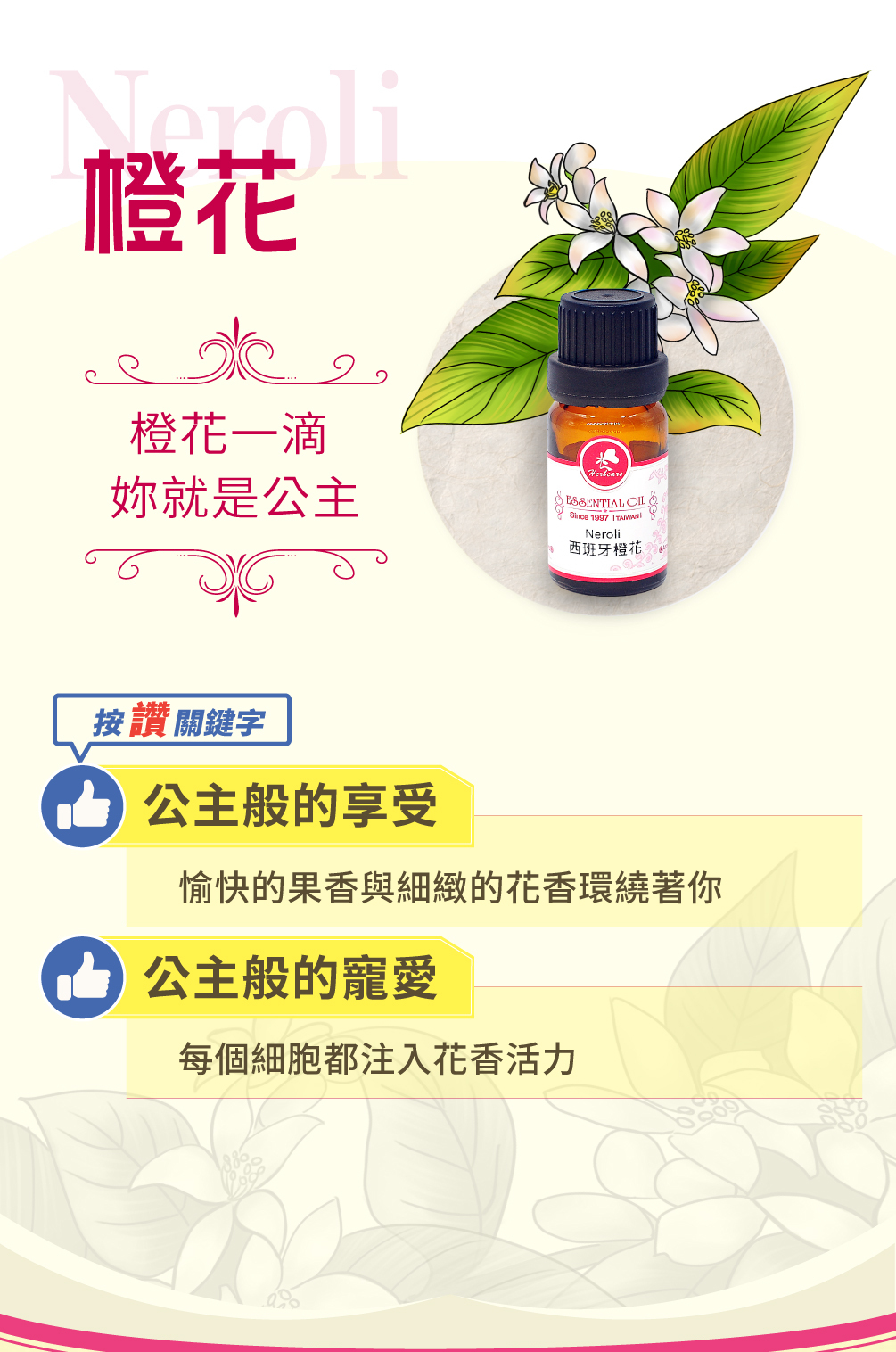 橙花精油帶有橙的甜美,更具有花香的濃郁,橙花精油有安撫、帶來祥和的感受。橙花的香味貴氣逼人,所以在很多知名品牌的香水中都會有橙花,而橙花有很好的激勵與活化效果,如果你想調一瓶用於臉部或是身體的抗老化按摩油,橙花精油是最適合的。另外他也有很好的安神效果,焦慮失眠不安的你,可以考慮橙花精油喔~~
