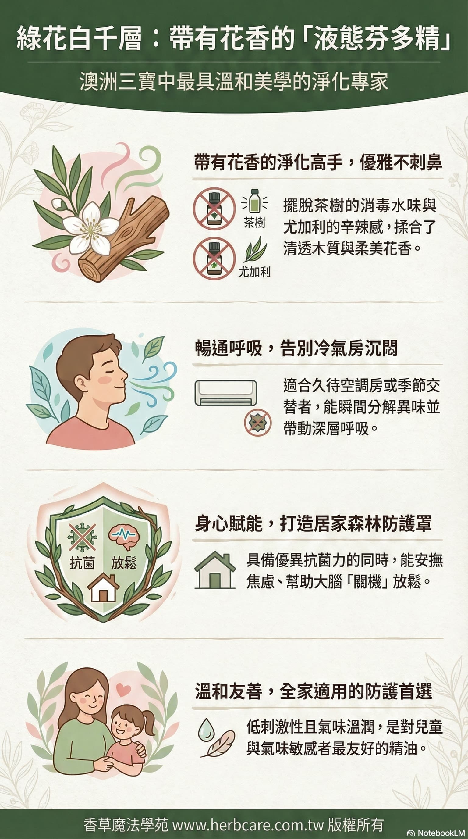 當你感到呼吸不暢、空氣沉悶,渴望一股來自大自然的清新能量?綠花白千層是白千層屬的植物,與尤加利,茶樹齊名,都是桃金娘科的精油,其氣味屬於消毒味道中帶有微微的花香,應用於激勵、提振精神。另若您較不能接受茶樹與尤加利精油氣味,其綠花白千層精油是另一個取代的選擇。