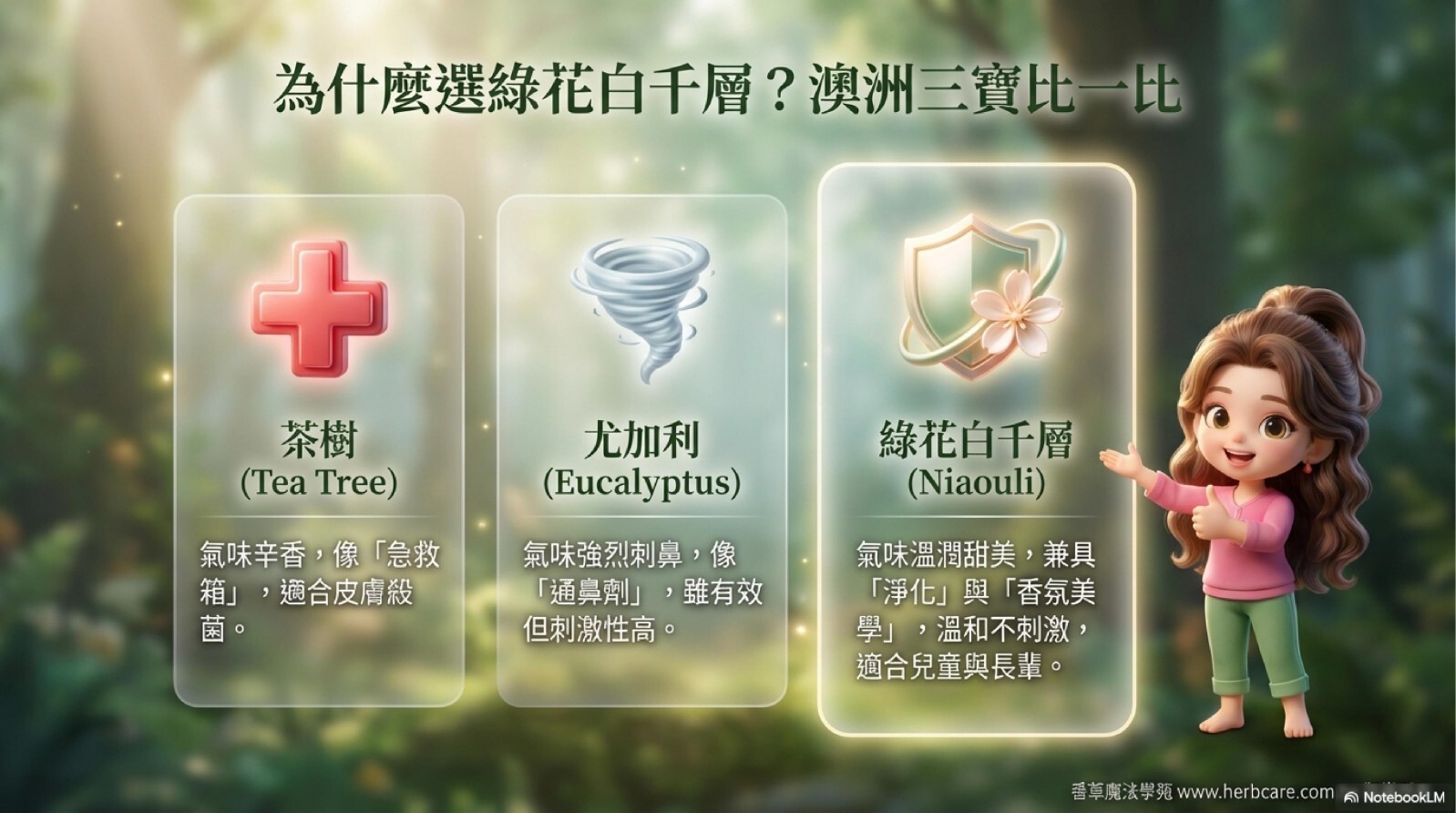 綠花白千層:比尤加利更溫和,適合兒童與敏感族群,但仍需稀釋。