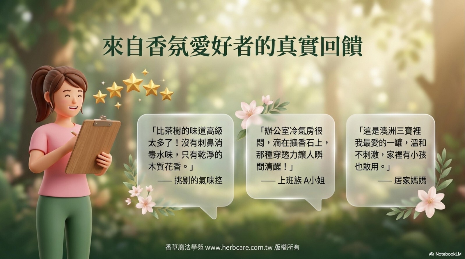 在這裡,我們分享一些用戶的真實體驗,讓您感受綠花白千層精油在生活中的溫柔力量。