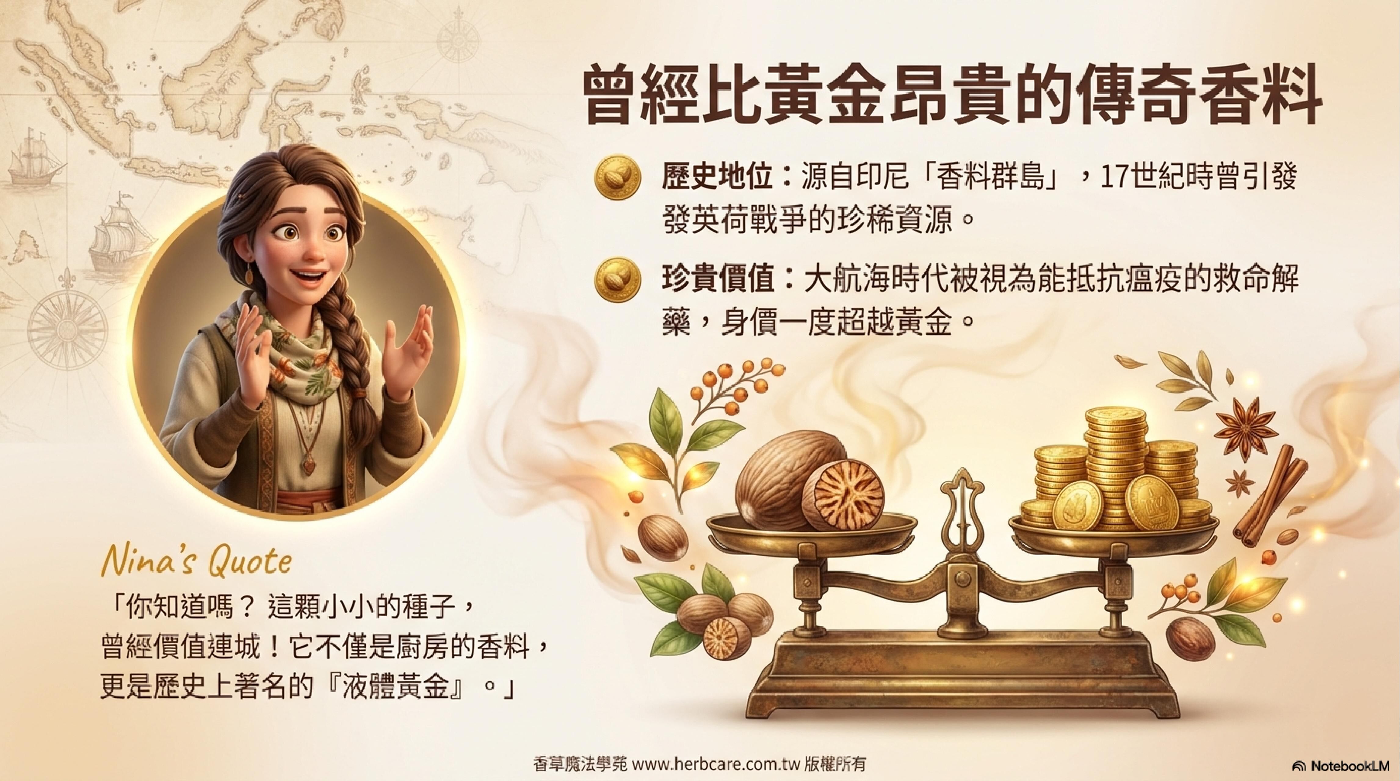 在17世紀的大航海時代,歐洲人為了爭奪肉豆蔻的產地(印尼香料群島),甚至引發了英荷戰爭!當時的人們相信肉豆蔻能抵抗瘟疫,這顆小小的種子曾經比黃金還昂貴。現在我們能輕鬆擁有它,真的很幸福!