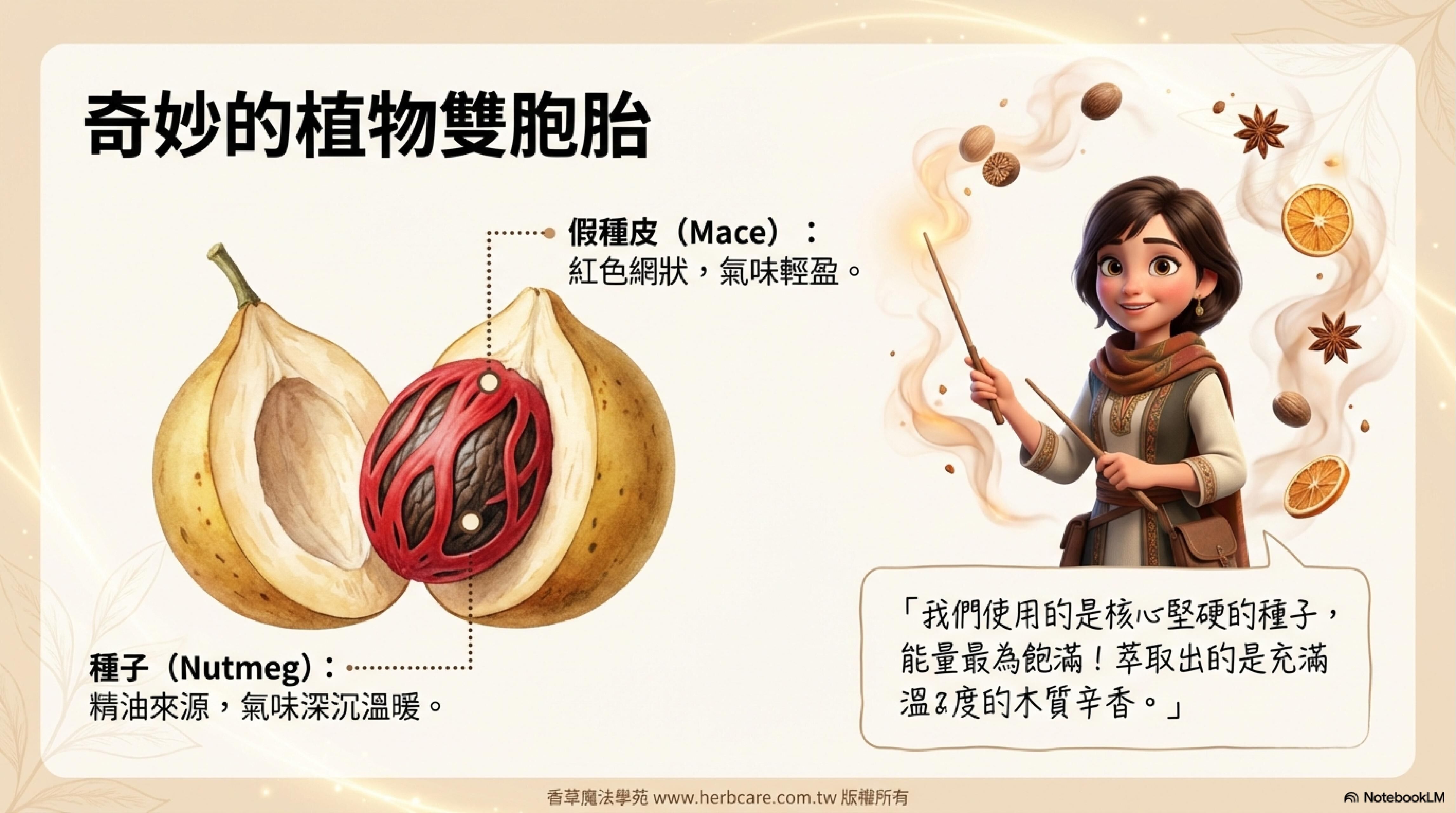 肉豆蔻樹很神奇,同一顆果實可以產出兩種香料:包裹在種子外面紅色的網狀假種皮是「肉豆蔻皮 (Mace)」,而裡面的硬核種子才是「肉豆蔻 (Nutmeg)」。精油通常萃取自種子,氣味較為深沉溫暖;皮的氣味則較輕盈。