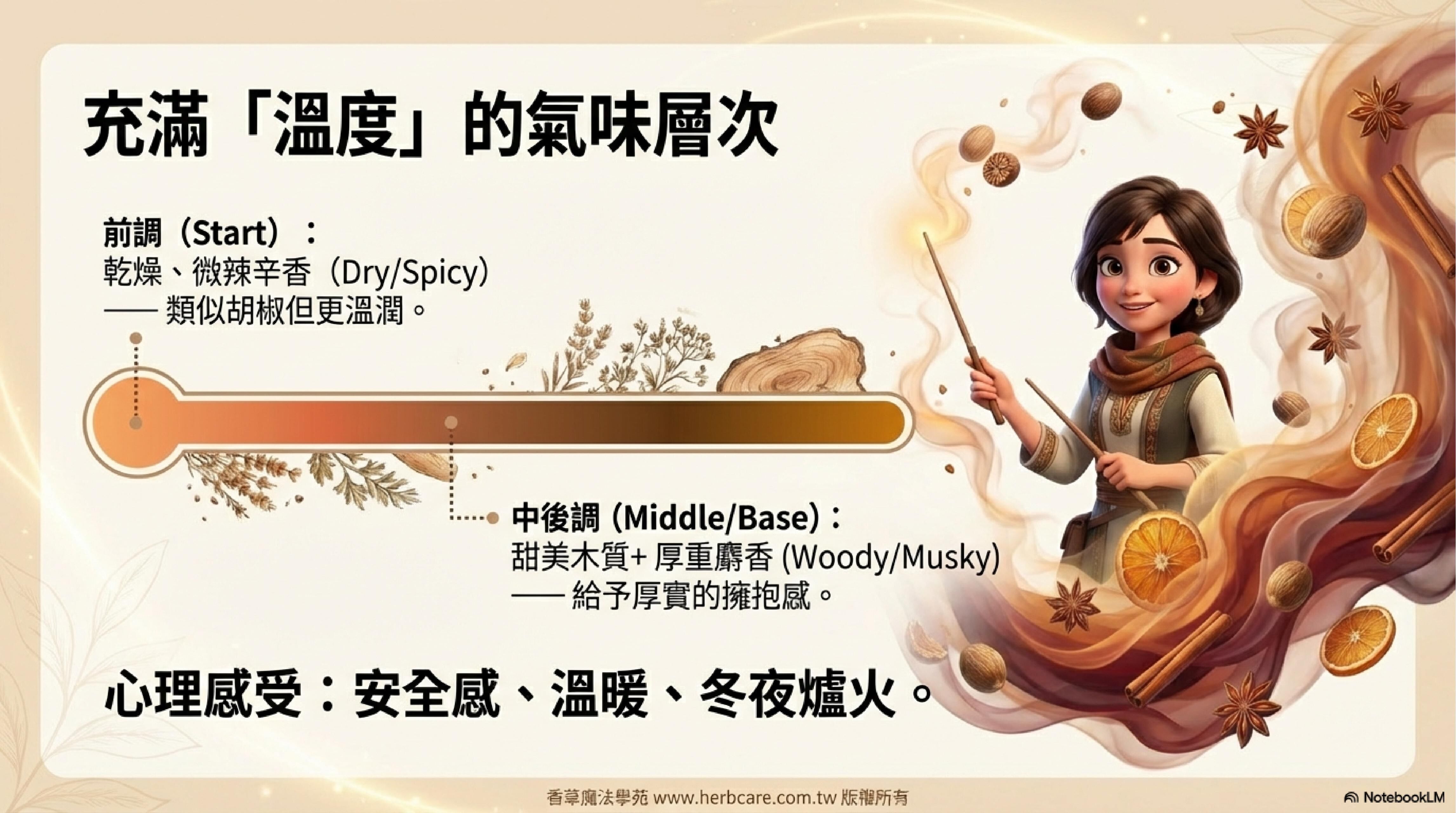 | 香氣描述 | 溫暖、強烈的辛香,帶有木質、麝香與淡淡的胡椒味 | ||