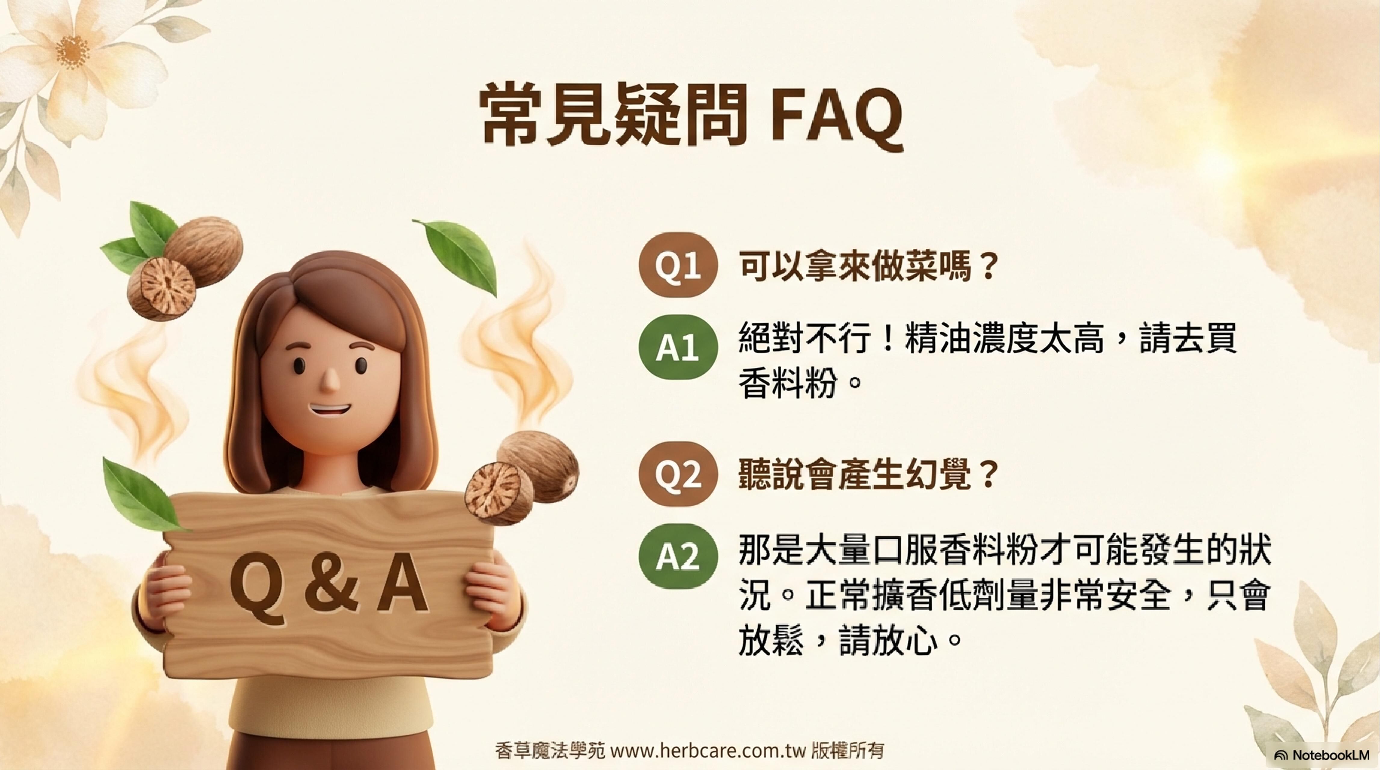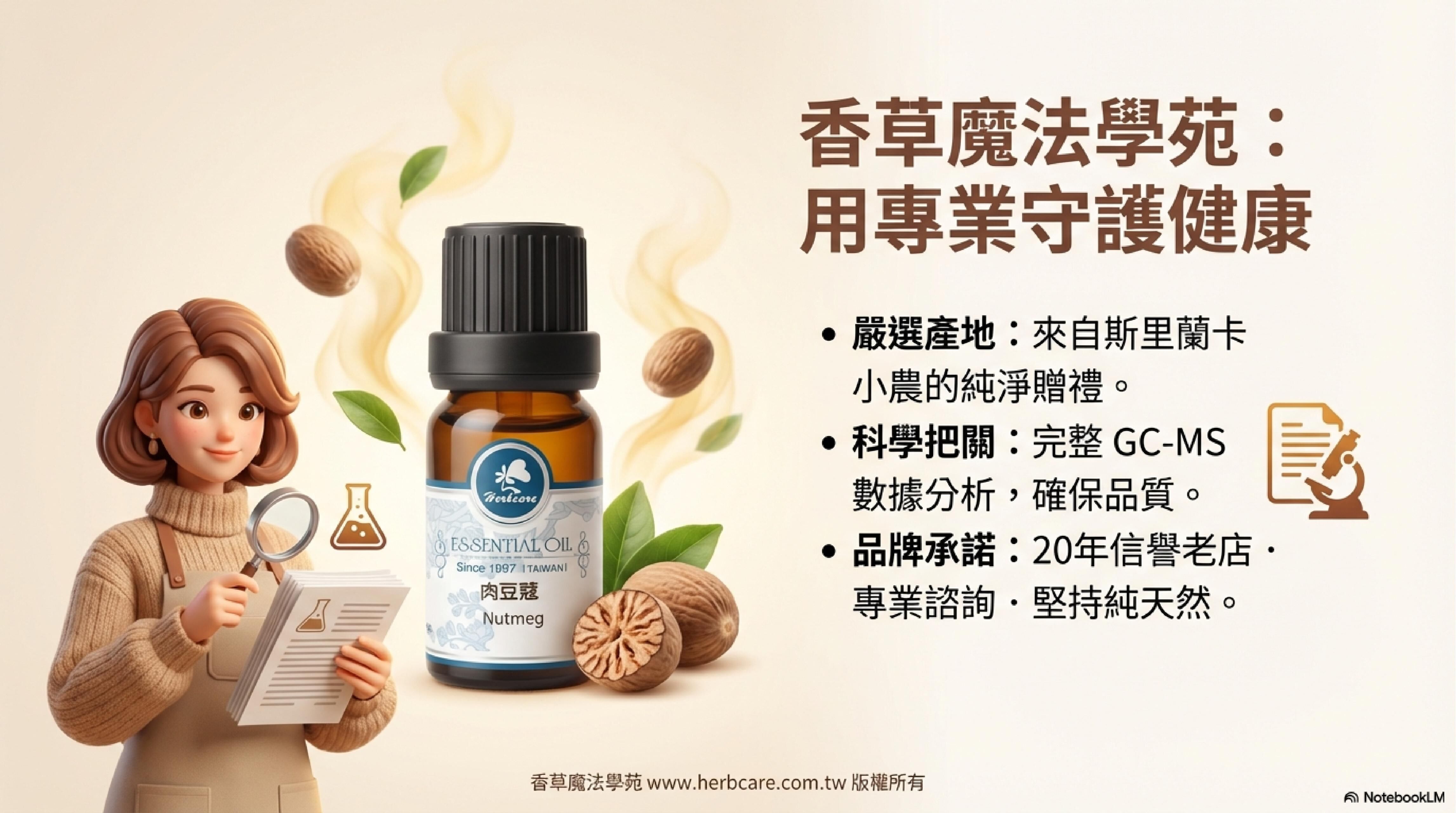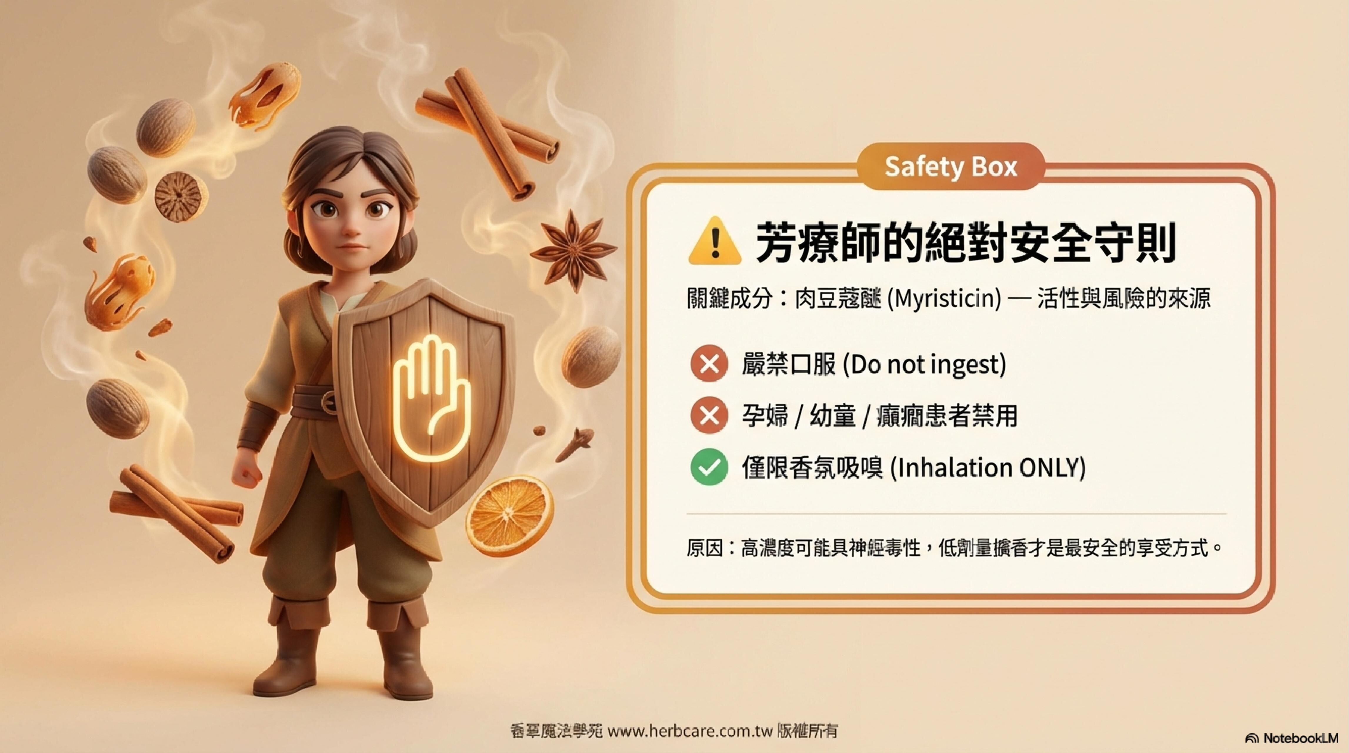 | Myristicin (肉豆蔻醚) | 4-10% | 關鍵活性成分! 低劑量的香味可提神、暖身;高劑量則有神經毒性風險,是使用限制的主因。 |