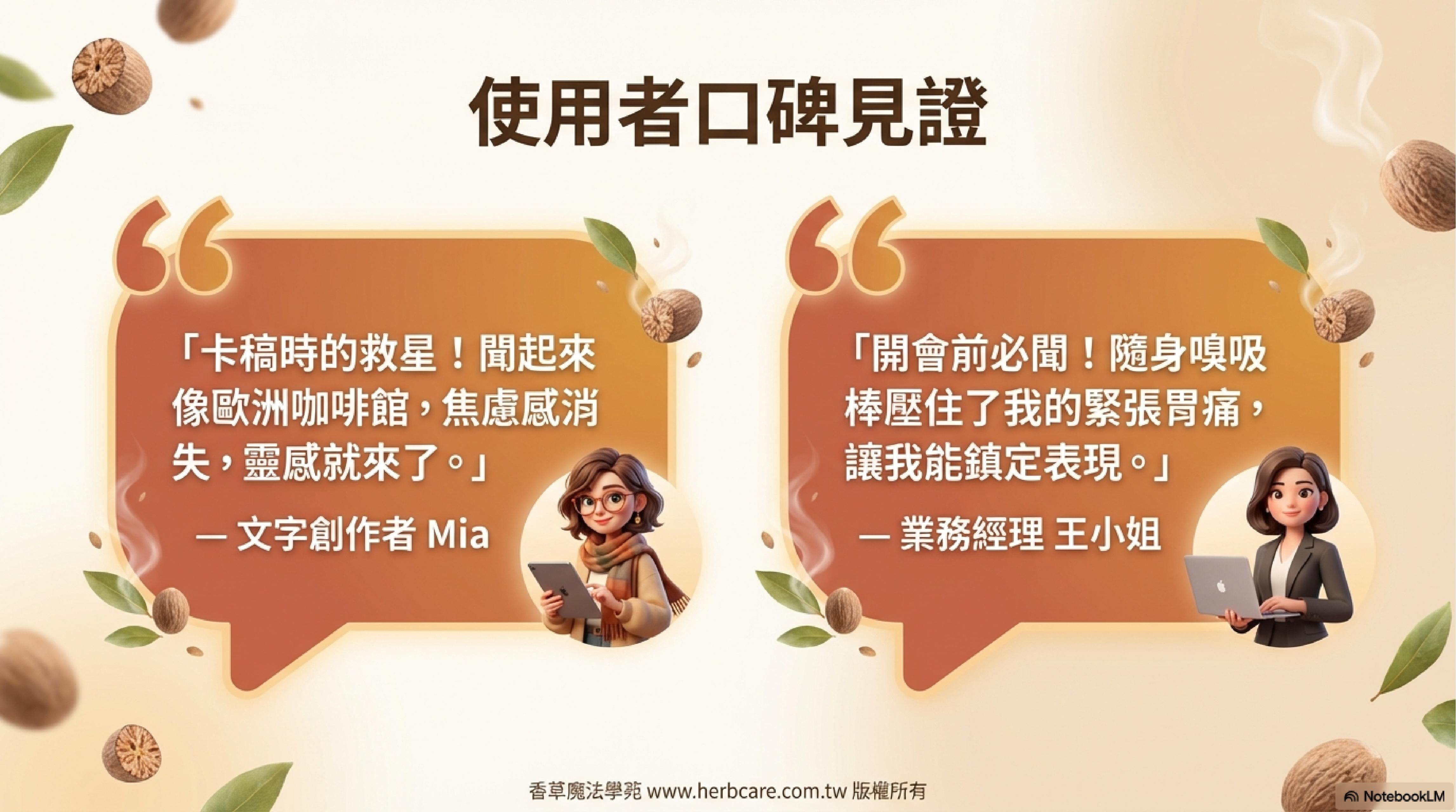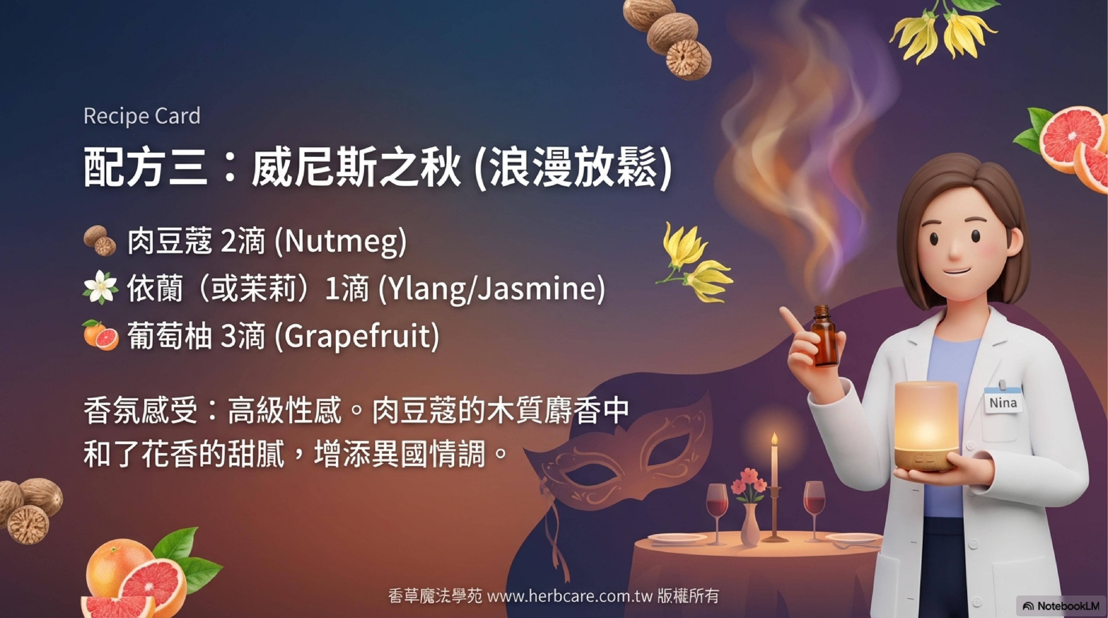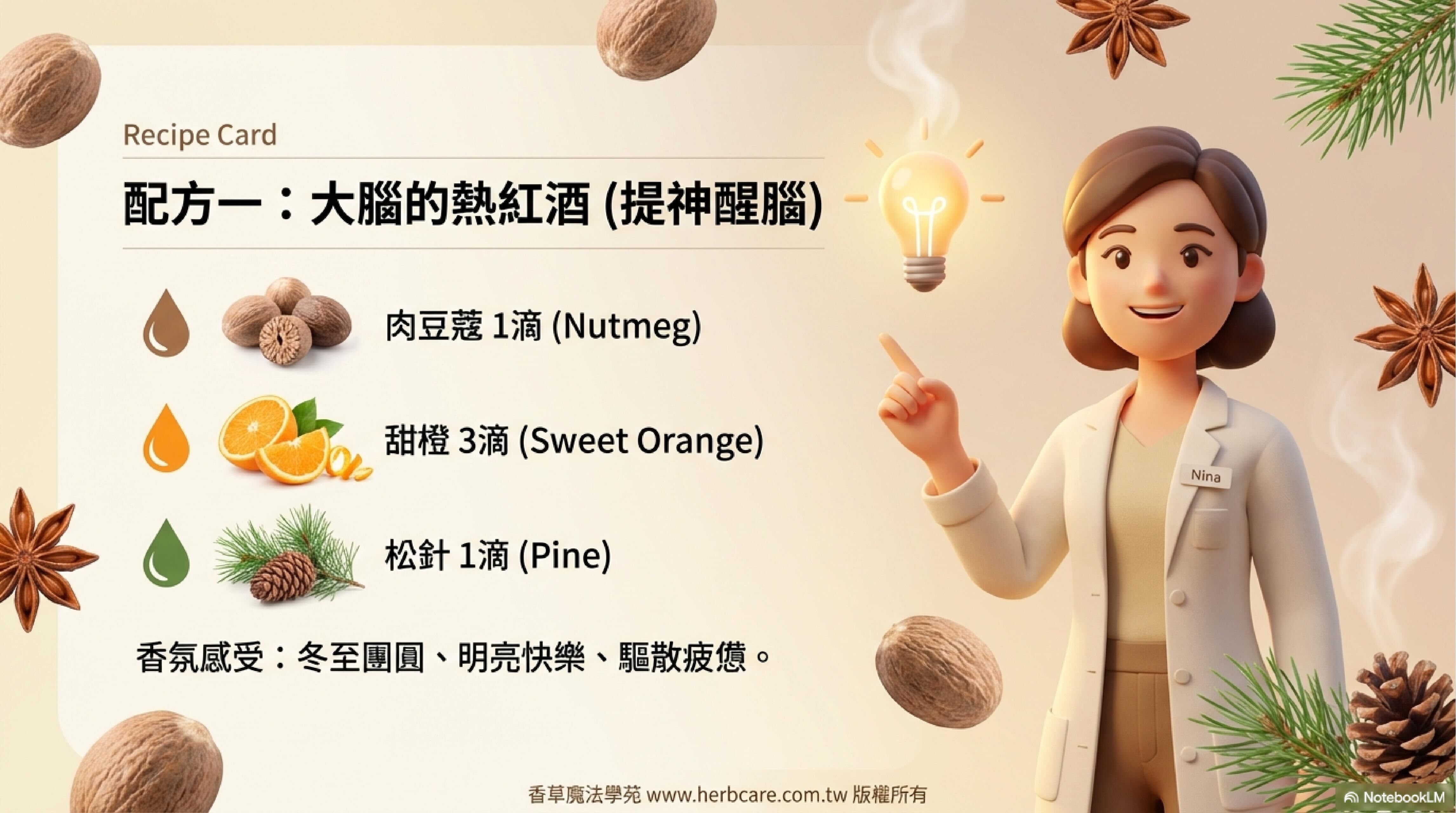 | Myristicin (肉豆蔻醚) | 4-10% | 關鍵活性成分! 低劑量的香味可提神、暖身;高劑量則有神經毒性風險,是使用限制的主因。 |