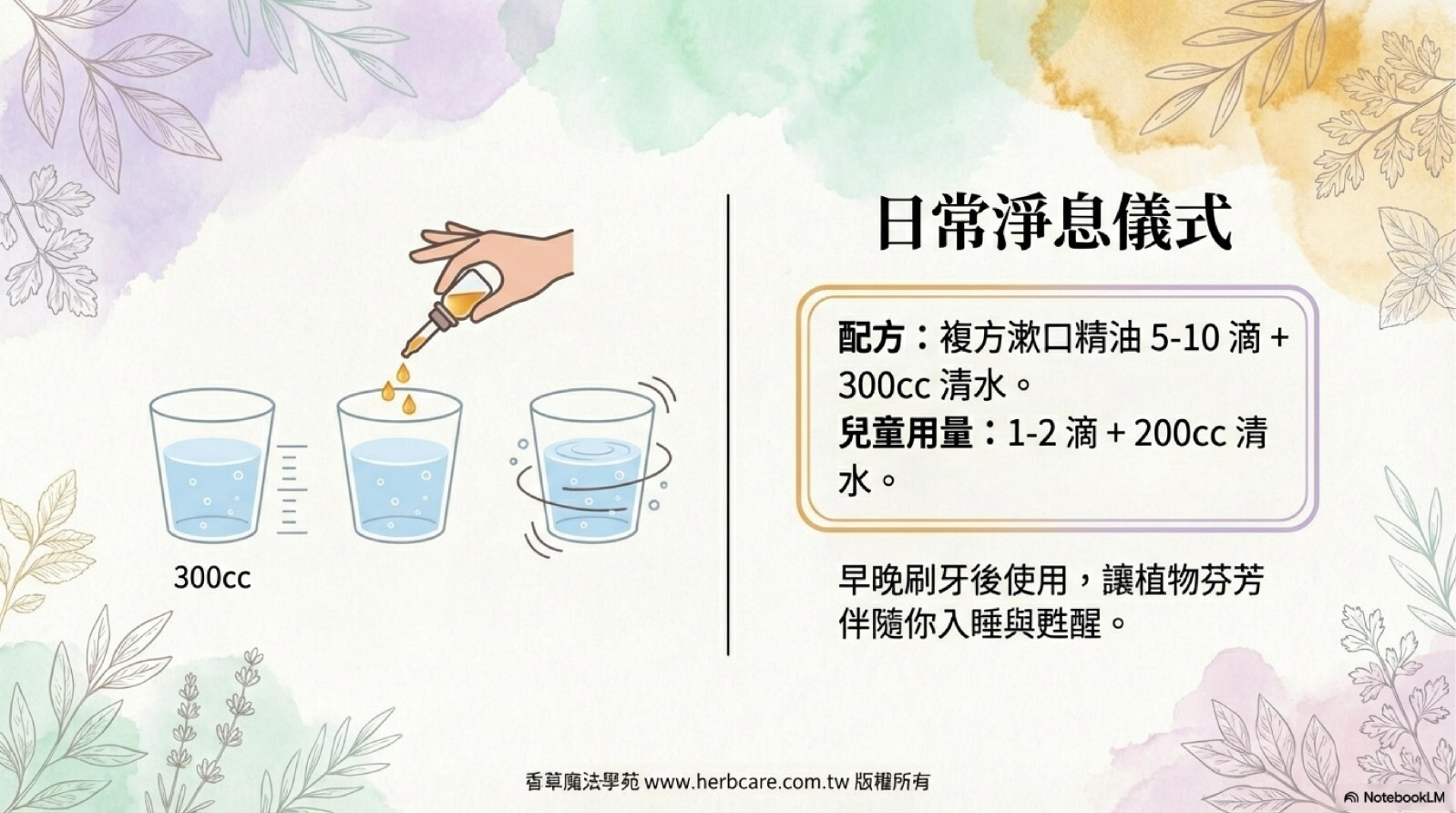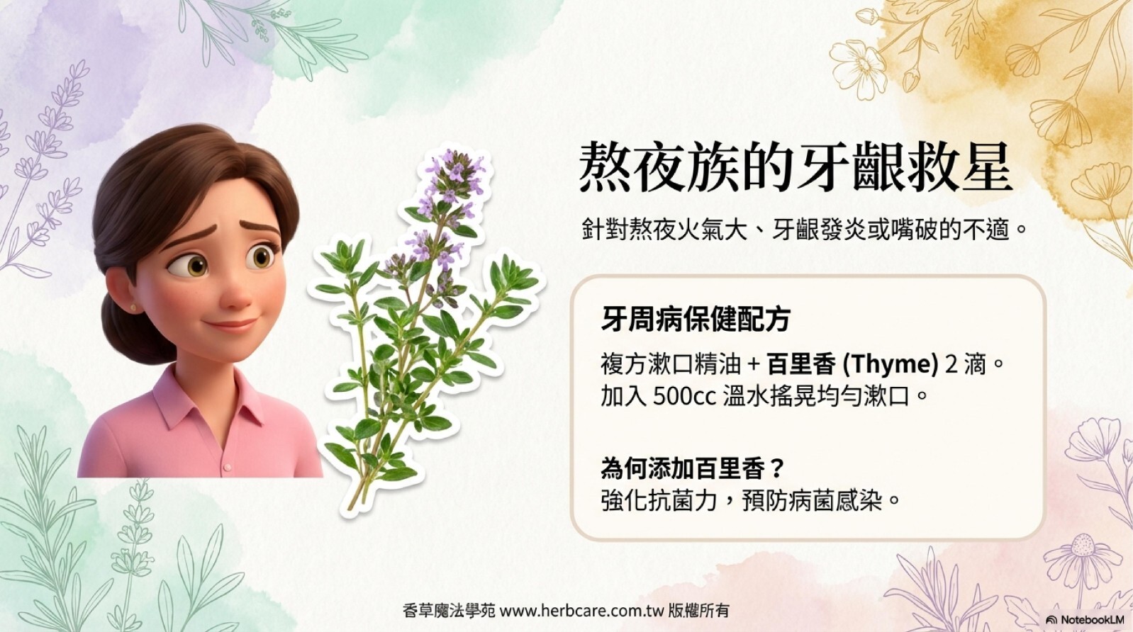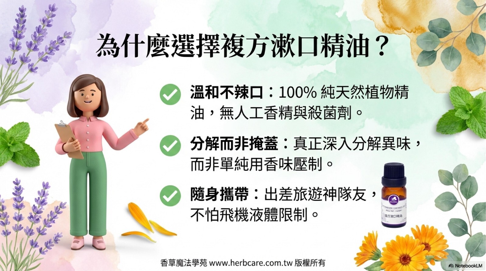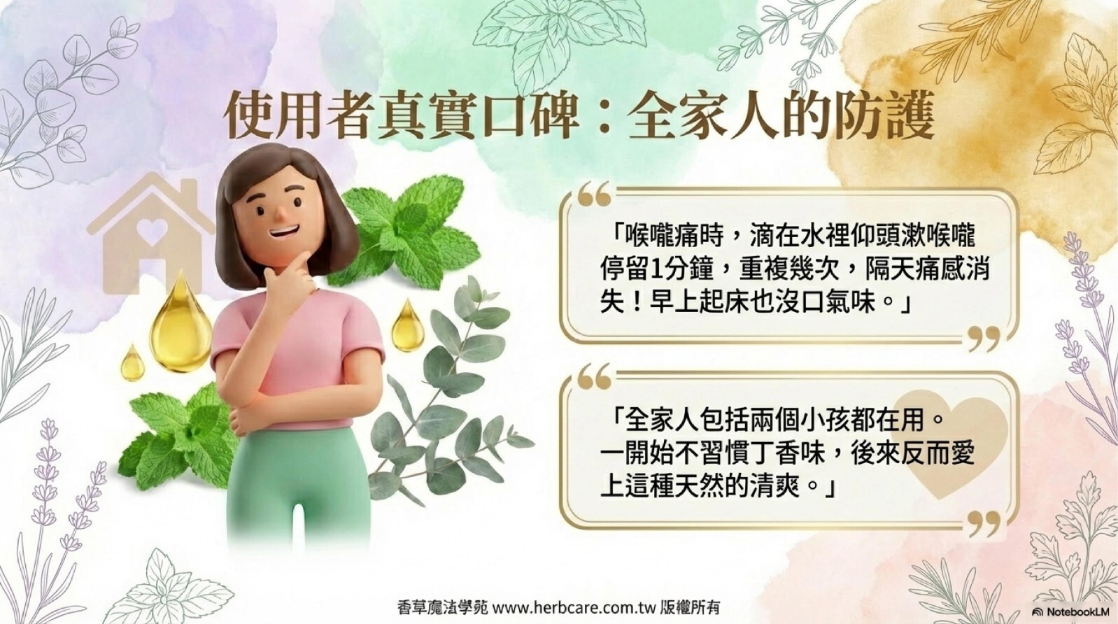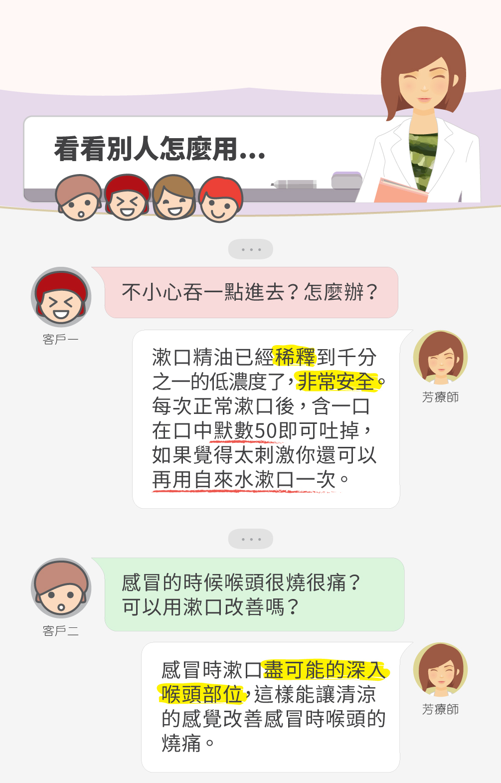 這個我可以分享:10月周年慶的時候跟你們買了一瓶漱口精油10ml,大概兩個禮拜之前,感冒喉嚨很痛,靈機一動,想到有一瓶漱口精油,就用家裡的RO純水,大約300ml,滴上一滴漱口精油,搖晃之後,喝了一口,但是沒有吞下去,而是讓它在喉嚨停留大約l分鐘左右的時間才吐出來,這樣的動作大概重複了三、四次,非常神奇的,我隔天喉嚨痛就消失了。這個經驗我本來前幾天要透過Facebook的Messenger跟你們講,但我忘記,因為一直太忙,今天看到這個訊息,又提醒我把它寫出來,我之前就已經有把它分享在Facebook上面,有圖為證,等一下傳給你們看。