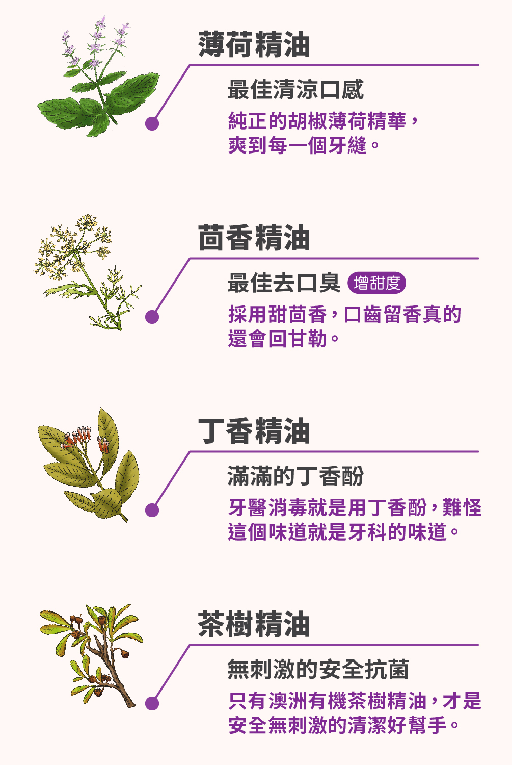 原本牙口的狀況就不好。所以,很容易牙齦腫或口腔黏膜破。漱口精油一出我就買來用。用過3、4次,傷口就好很多,起碼吃東西時不會那麼刺激。而且,刷完牙漱口精油漱口後,清爽的感覺比市面的持久。