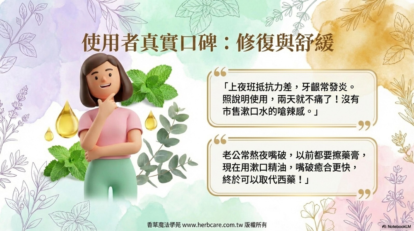 我先生因為工作關係常常要加班熬夜,所以常常都會嘴破…但其實剛入手這瓶漱口精油的時候並沒有想到這個功效…但因為熬夜口氣不好就叫他早晚和帶到公司吃完飯用這個漱口,意外的不知道為什麼是不是有直接的關係…嘴破好像更快癒合了呢⋯⋯以前都是擦口內膠才能很快見效的,但因為裡面含有類固醇我一直很希望不要用,但因為生活作息型態有沒有辦法,但現在如果用這瓶就可以取代原來的西藥成分,那我想我會繼續試試看的