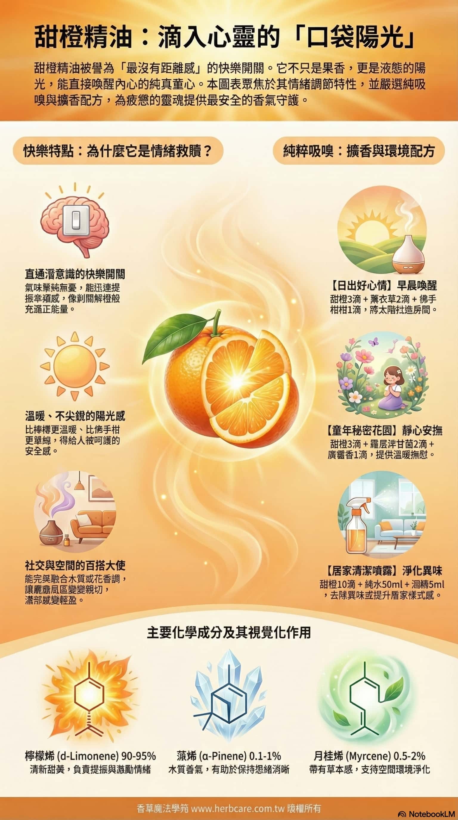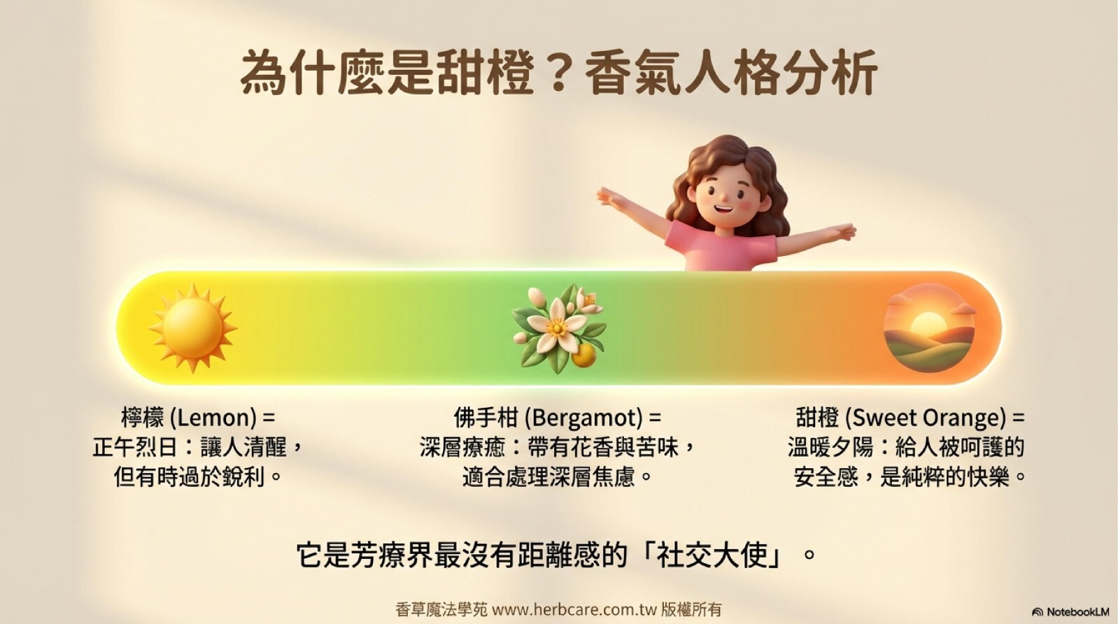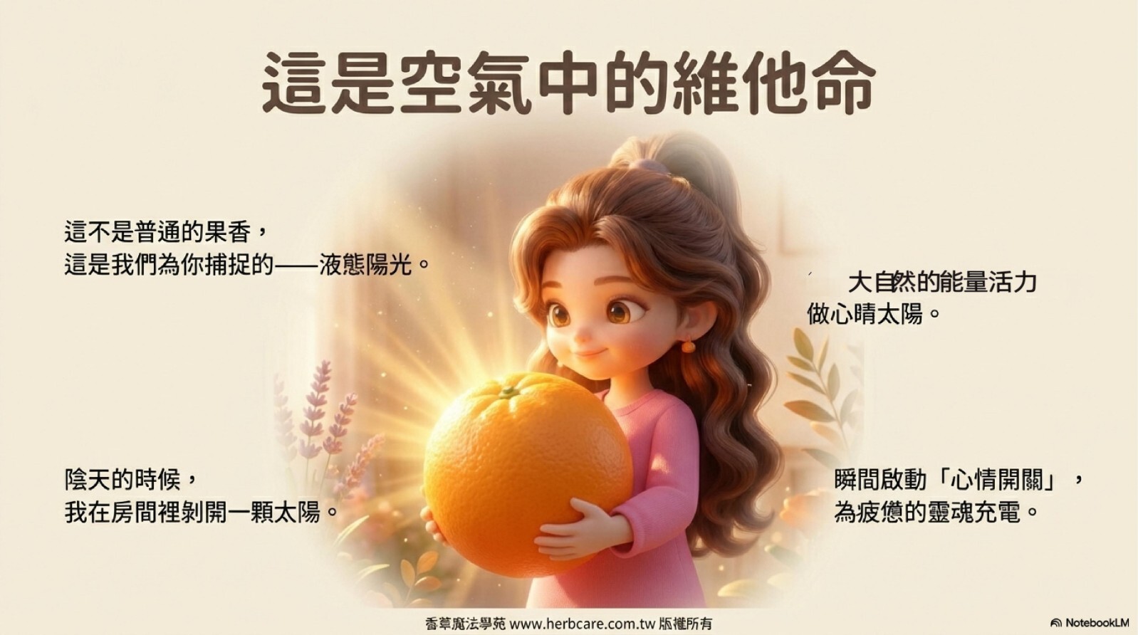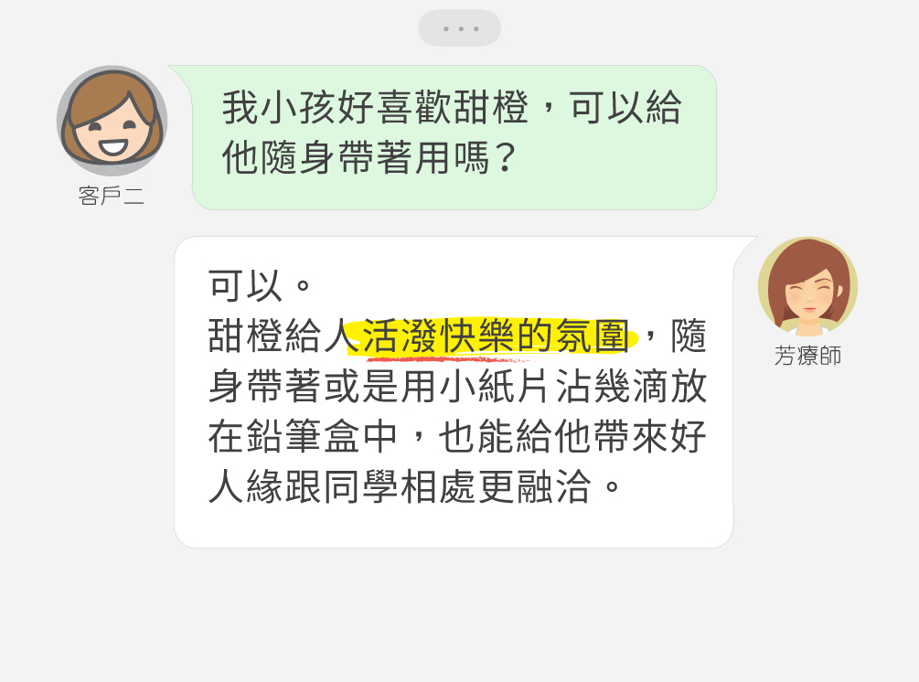 | A1: 甜橙精油的香氣成分檸檬烯,被認為與提升情緒有關。在許多文化中,甜橙也象徵著陽光、溫暖與豐盛,聞到它,就像是收到了來自大自然的禮物,自然而然就感到心情愉悅。 |