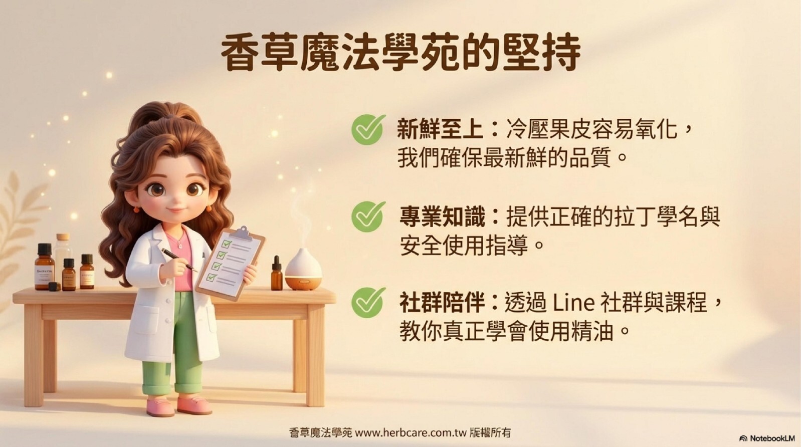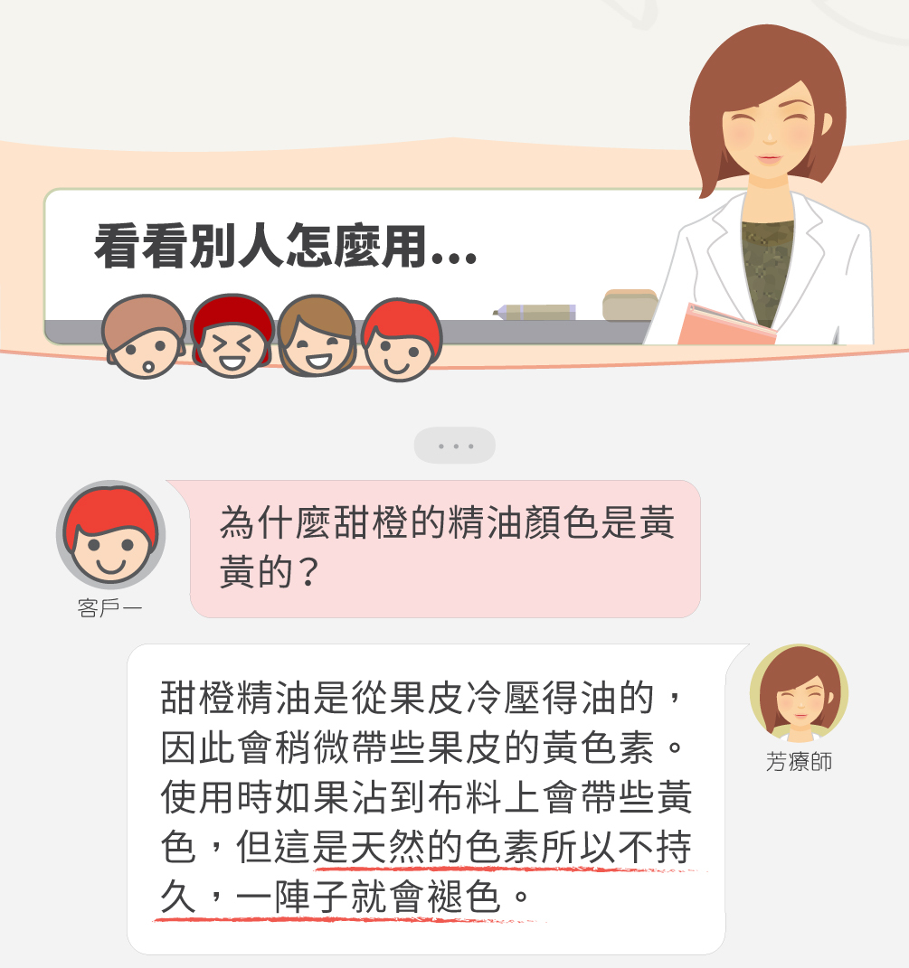 | A4: 甜橙精油是透過冷壓果皮取得,其分子結構相對不穩定,因此容易氧化。建議在開封後六個月內使用完畢,並避光、避熱保存,才能確保精油品質。 |