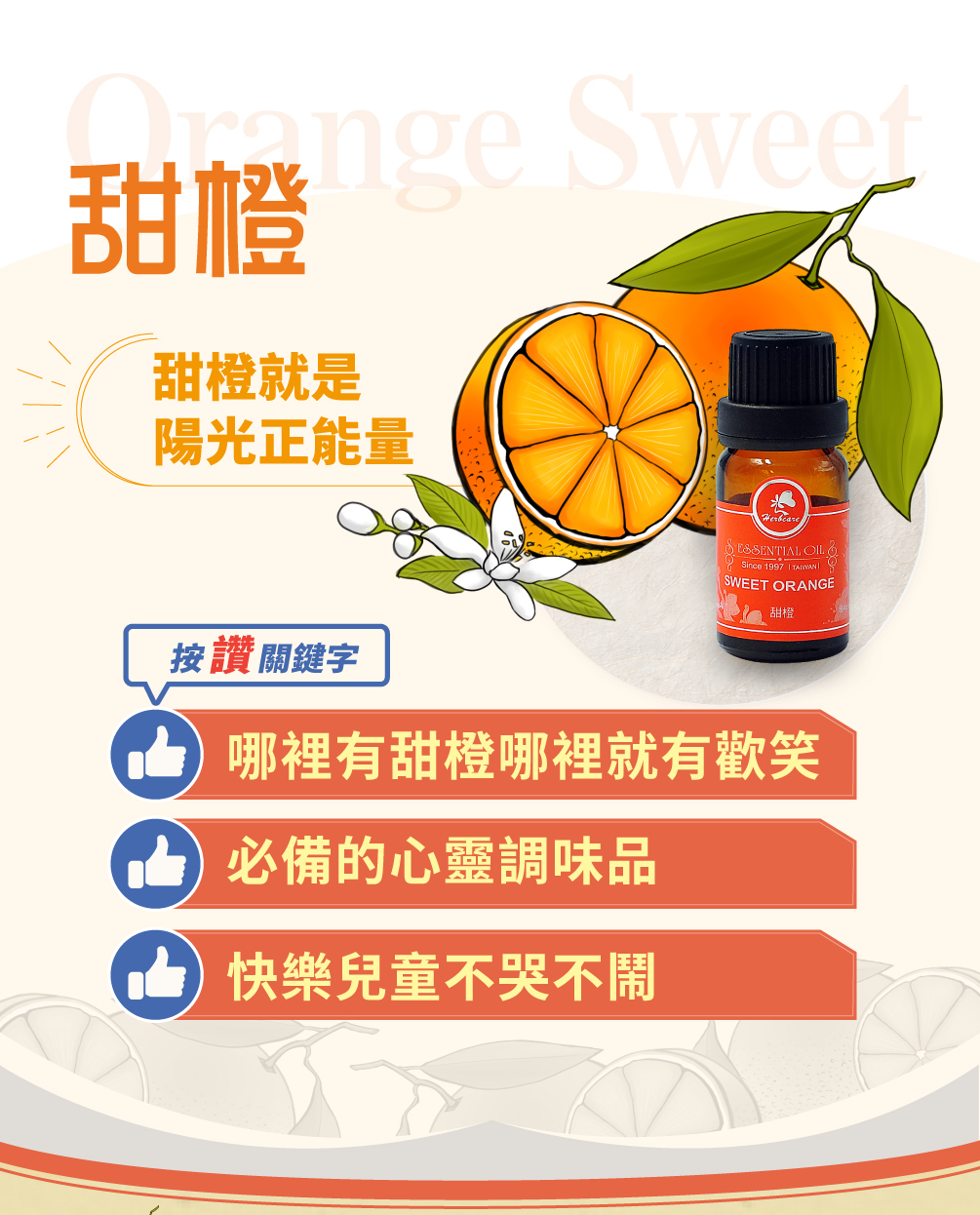 甜橙的溫和香氣,可以與多種精油創造出不同的應用效果。