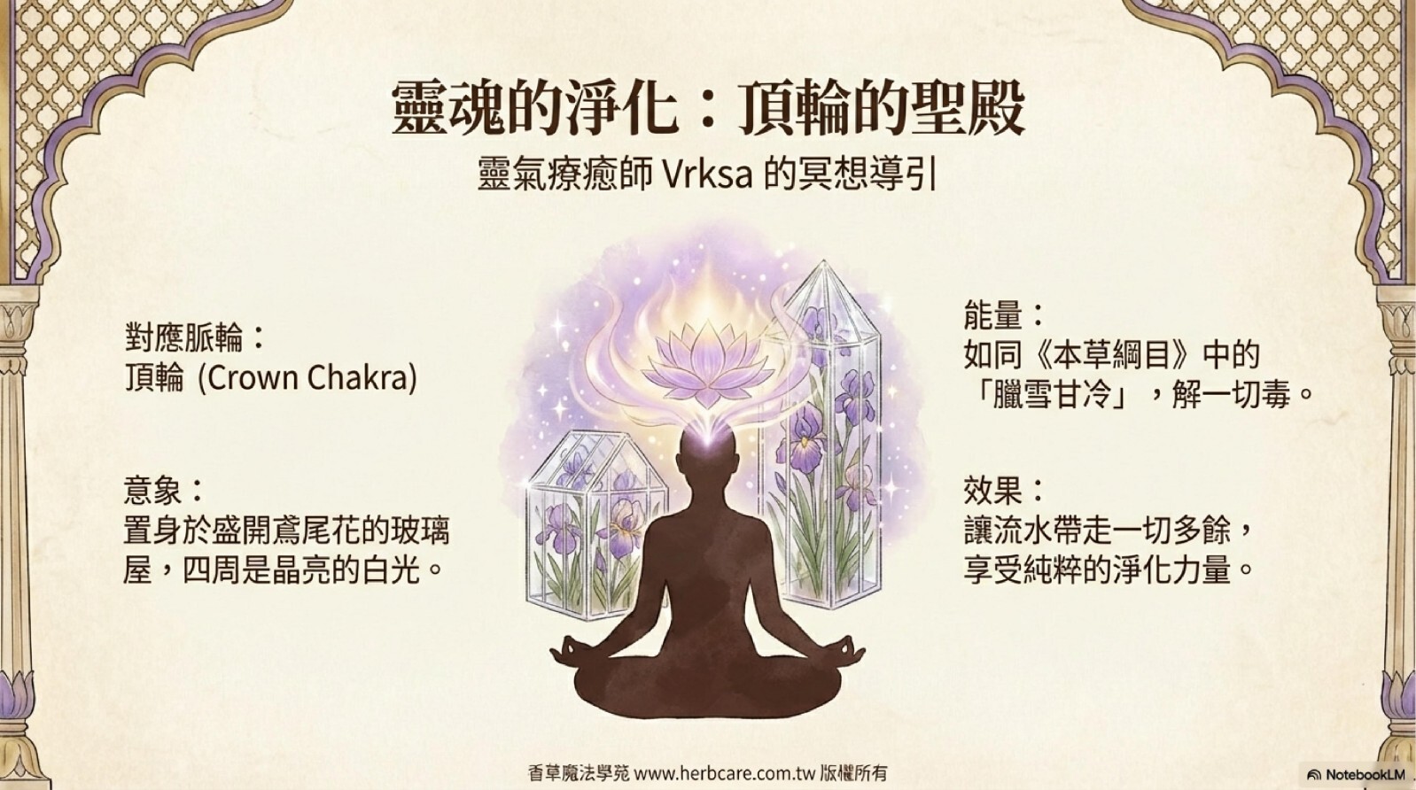 從第一次接觸鳶尾花至今,帶來的感知都是全身,從頭到腳的徹底淨化。嗅吸尾花的原精油,瞬間進入開滿鳶尾花的 空間,仔細觀望,此刻正身處在盛開著無數朵鳶尾花的玻璃屋中,四周散發著晶亮的白光,這是靈性學習者常說的「聖殿」,被淨化的能量包圍著。逐漸地在淨化 後,感知妳成為一朵鳶尾花,在花蕊、花瓣上都閃耀著金黃色光采,流過根部的水流,因為淨化的力量變更潔淨清徹,如同高山融化的雪水般清純,正如同《本草綱目》對雪水的評價 “臘雪甘冷無毒,解一切毒”般,全身感受被淨化的能量。
