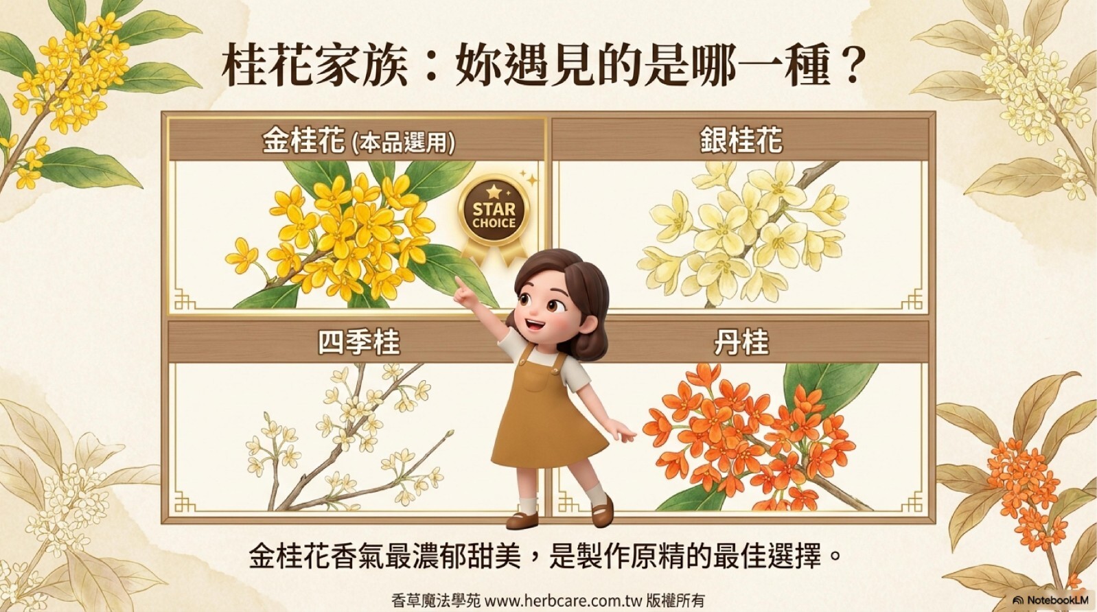 桂花在東方文化中被視為愛情、美麗和幸福的象徵。桂花精油由桂花的花朵提煉而成,被廣泛應用於芳香療法和香水製作中。桂花原產於中國,目前在全球各地都有種植。桂花精油具有芳香、甜美和花香的香味,帶有柑橘和茉莉的氣息。主要成分包括類黃酮、橙花醇、橙花酮和橙花醛等化合物。常見的桂花品種及其主要差異: