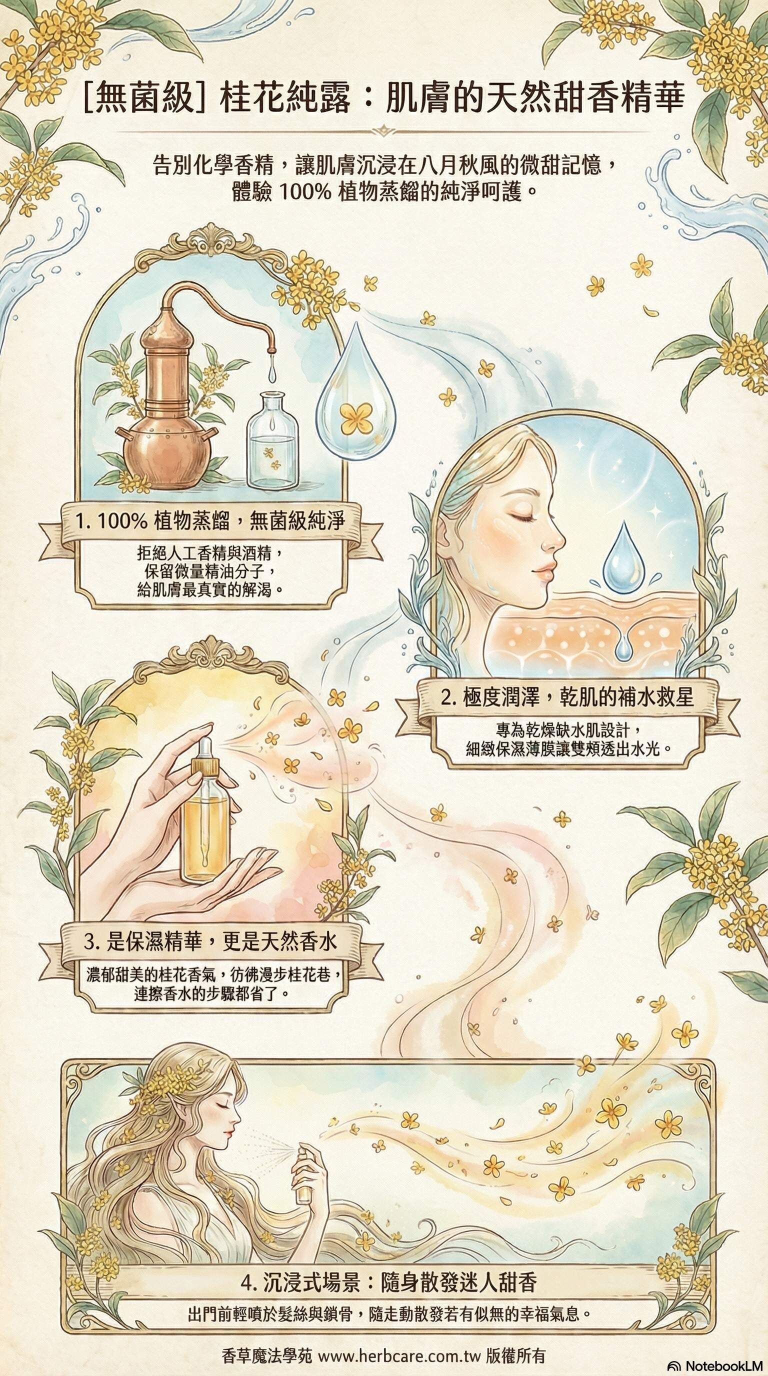 桂花純露,只萃取純露,不提取精油的最高等級,採無菌製程,嚴選較一般桂花更為金黃且香氣更濃郁的金桂。本品無額外添加,含有微量的桂花精油,包括桂花醇、棕櫚酸、月桂酸、芳樟醇、紫羅蘭酮等成分,讓肌膚保持潤澤和柔軟,全方位滋養肌膚,其特性還能有效抵禦外界環境對肌膚的傷害。保養的同時馥鬱的桂花香一同鑽入鼻腔,沁人心脾帶動嗅覺神經。非常適合夏日夜晚使用,如熱浪褪去後的一陣清風,讓身心與肌膚一同獲得療癒。