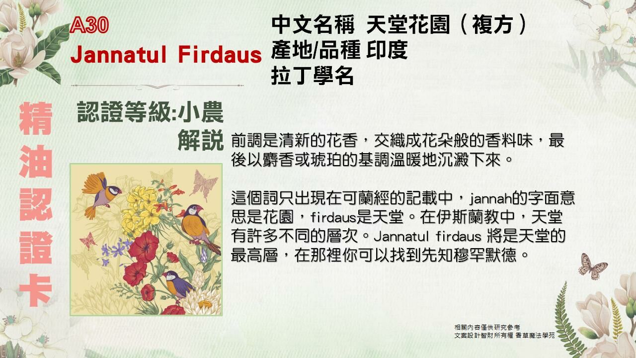 Jannatul Firdaus天堂花園其實是一種複方,它是用多種植物材料做提煉來源,例如茉莉、琥珀、岩蘭草、香根草、麝香草、玫瑰、蓮花......