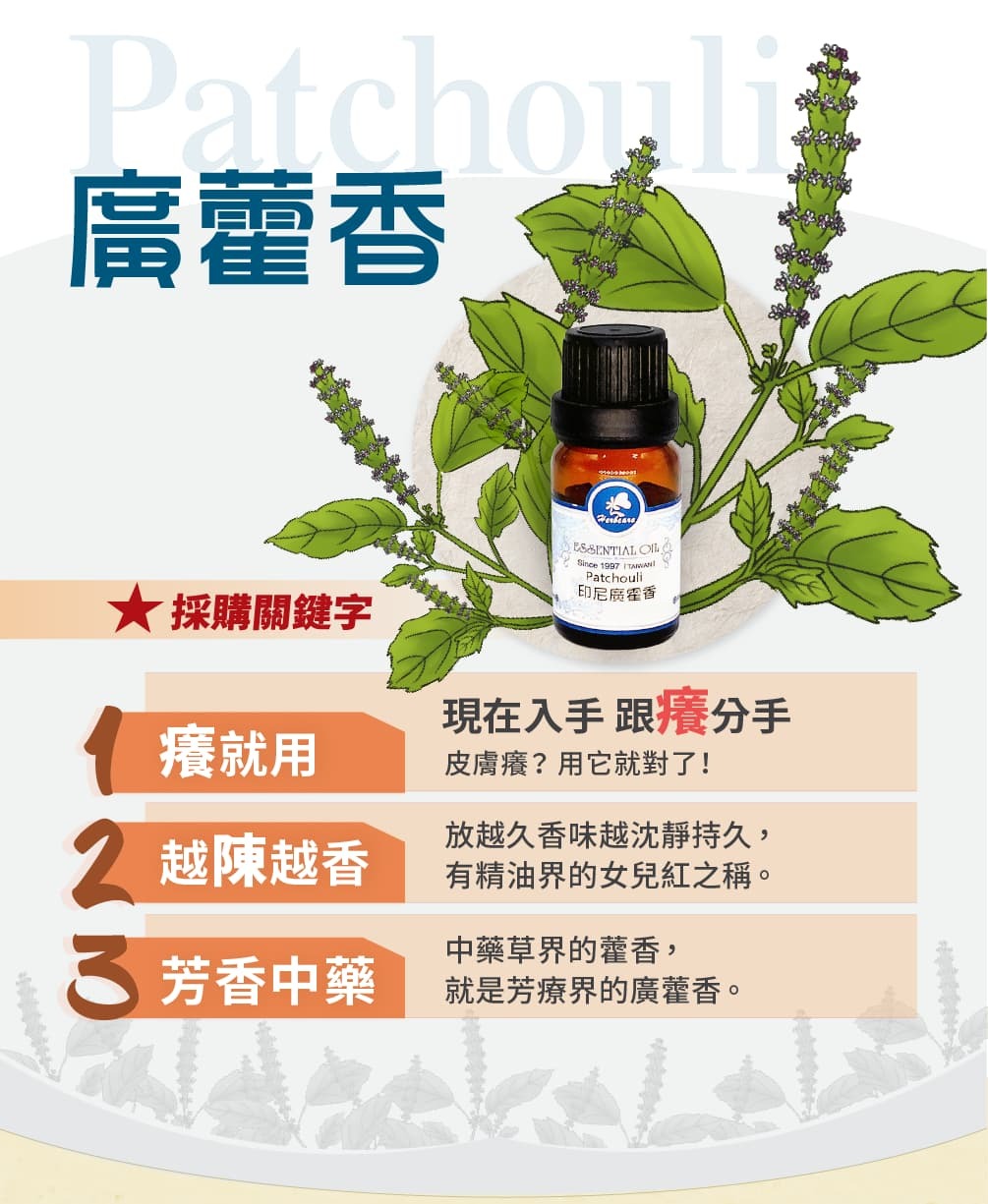廣藿香精油對歐美芳療師來說,有種東方神秘氣息,因此常用來作為神秘香水,異國情調香水的原料,但是對我們來說,它就是”藿香”,因主產於兩廣及南亞洲,故稱為廣藿香。了解了這個就知道為何它的香味對我們是如此熟悉,因為這就像是中藥店的香味,而在許多中藥方中,藿香更是常見的配方。因此在選品時,香氣/外觀/純度/功效都是參考點,好的廣藿香,香氣溫順入鼻舒暢,給人安全感,外觀呈深棕色液體,香味持久且不刺鼻,選擇時需細心辨識。另外,由於廣藿香精油的香氣會隨著時間越陳越香,其香氣會變得更加圓潤、飽滿。這些都是精油的身分證,能確保你買到的是純正且高品質的產品。