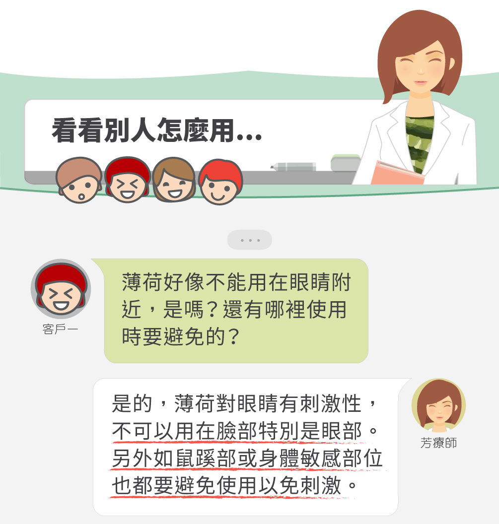| A2: 薄荷精油的薄荷醇成分較強烈,可能對孕婦和嬰幼兒的身體造成負擔。建議2歲以下嬰幼兒、孕婦與哺乳期婦女都應避免使用。 |