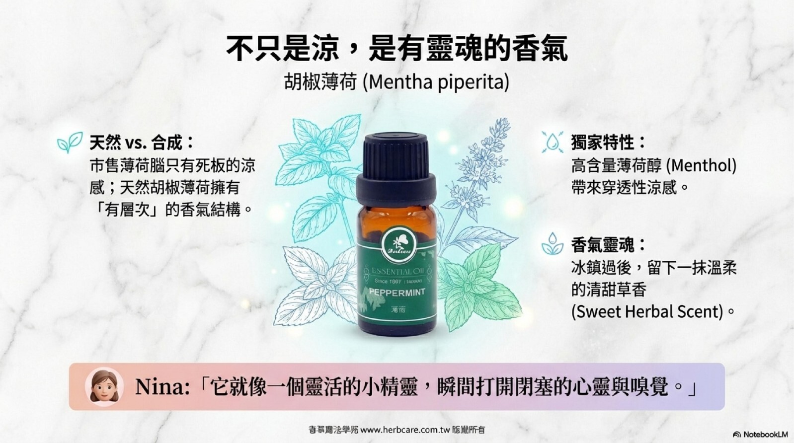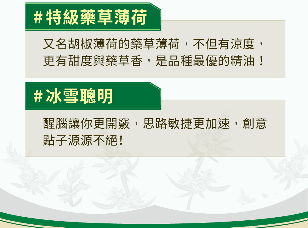 | A4: 這是由於其主要成分薄荷醇所致,其強烈的穿透性氣味與清涼感,正是薄荷精油的標誌性特徵。 |