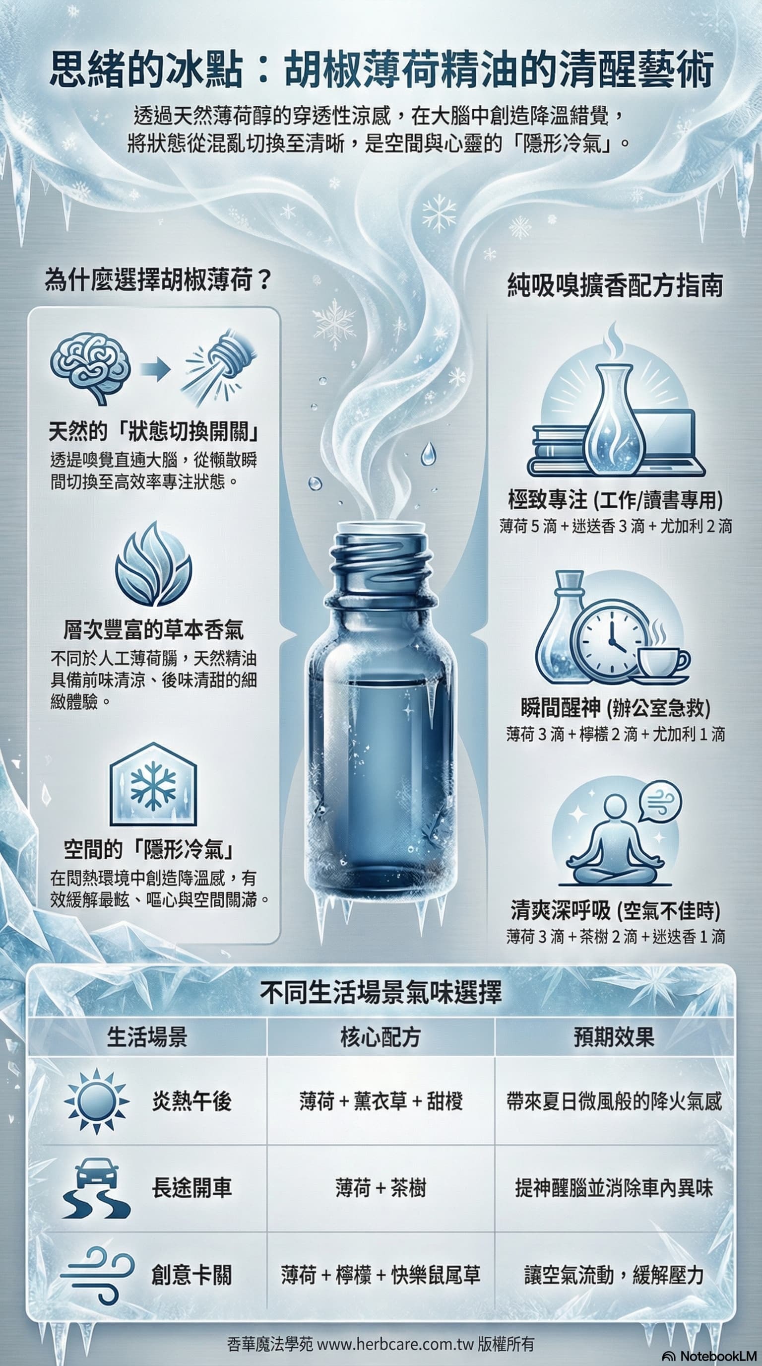在炎炎夏日、精神不濟的午後,你是否渴望一股清涼的力量,能瞬間提振身心?薄荷精油,這款帶有強烈穿透性香氣的精油,正是你最需要的天然醒腦劑。從古埃及人到古羅馬人,薄荷就因其獨特的清涼感而被廣泛應用於淨化空氣、提神醒腦。它獨有的清涼因子能瞬間喚醒你的五感,為你帶來一股冰鎮的清流。無論是想為頭腦帶來清明感,或是想為身體注入清爽活力,薄荷精油都能成為你的高效夥伴。它不只是一款精油,更是一種直接、純粹的能量補充。讓薄荷精油的冰涼力量,為你的生活帶來瞬間的清醒與舒暢。