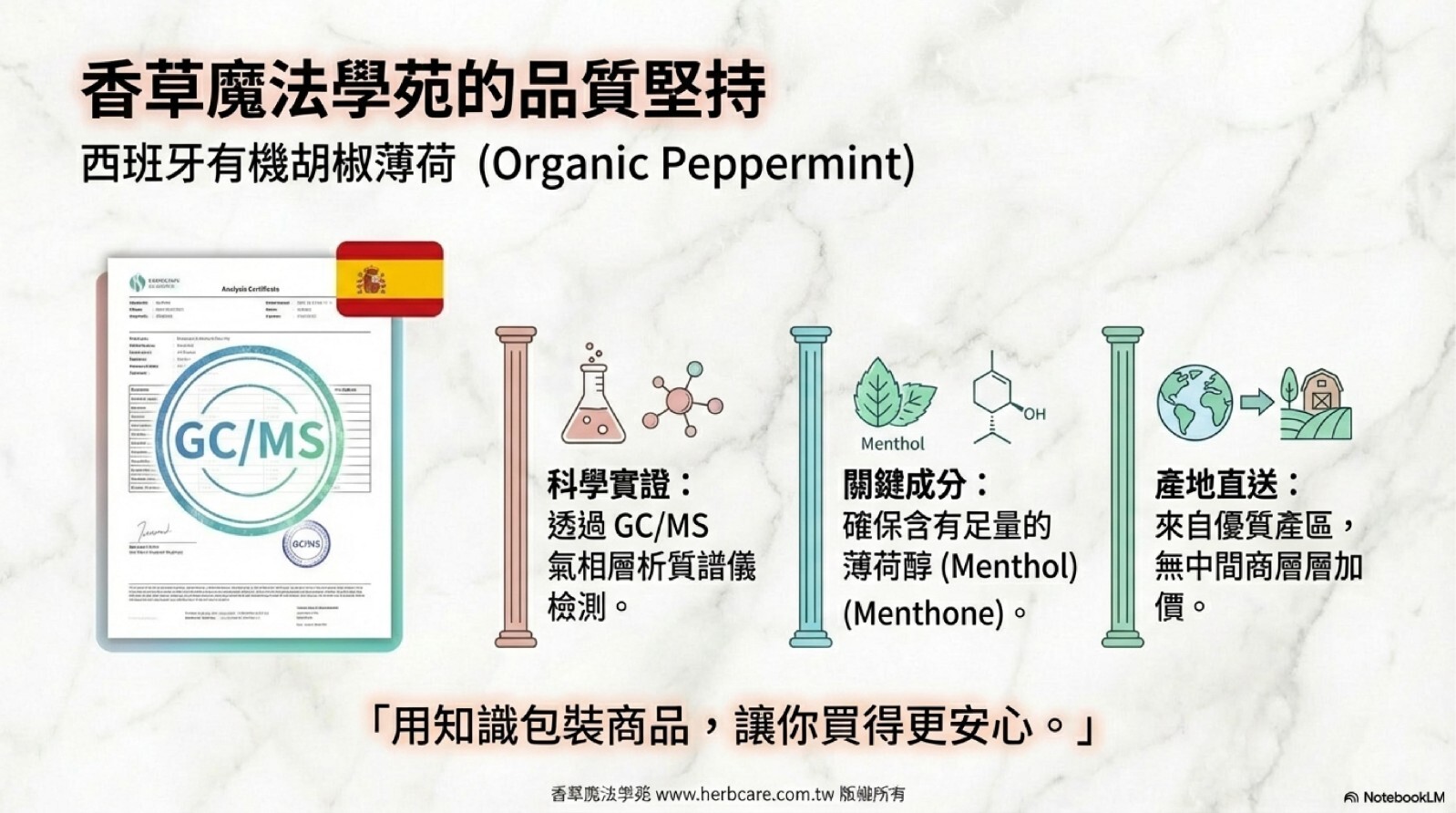 挑選薄荷精油時,首先要注意其香氣的複雜度。好的薄荷精油聞起來應該是帶有穿透力的清涼感尾味能聞到甜美的草香,而不是有奇怪的化學味或雜質,或是簡單的只有清涼味。由於薄荷精油的成分複雜,GC/MS檢測報告是判斷其品質的重要依據。報告應清楚顯示薄荷醇、薄荷酮等主要成分的含量,以確保其效果。此外,由於薄荷精油的薄荷醇含量高,可能會對某些人造成刺激,因此在選購時,也要留意品牌的專業度與信譽,是否提供詳細的使用建議與注意事項,以保障使用者的安全。一個負責任的品牌,會像你的芳療顧問一樣,為你把關好每一步。