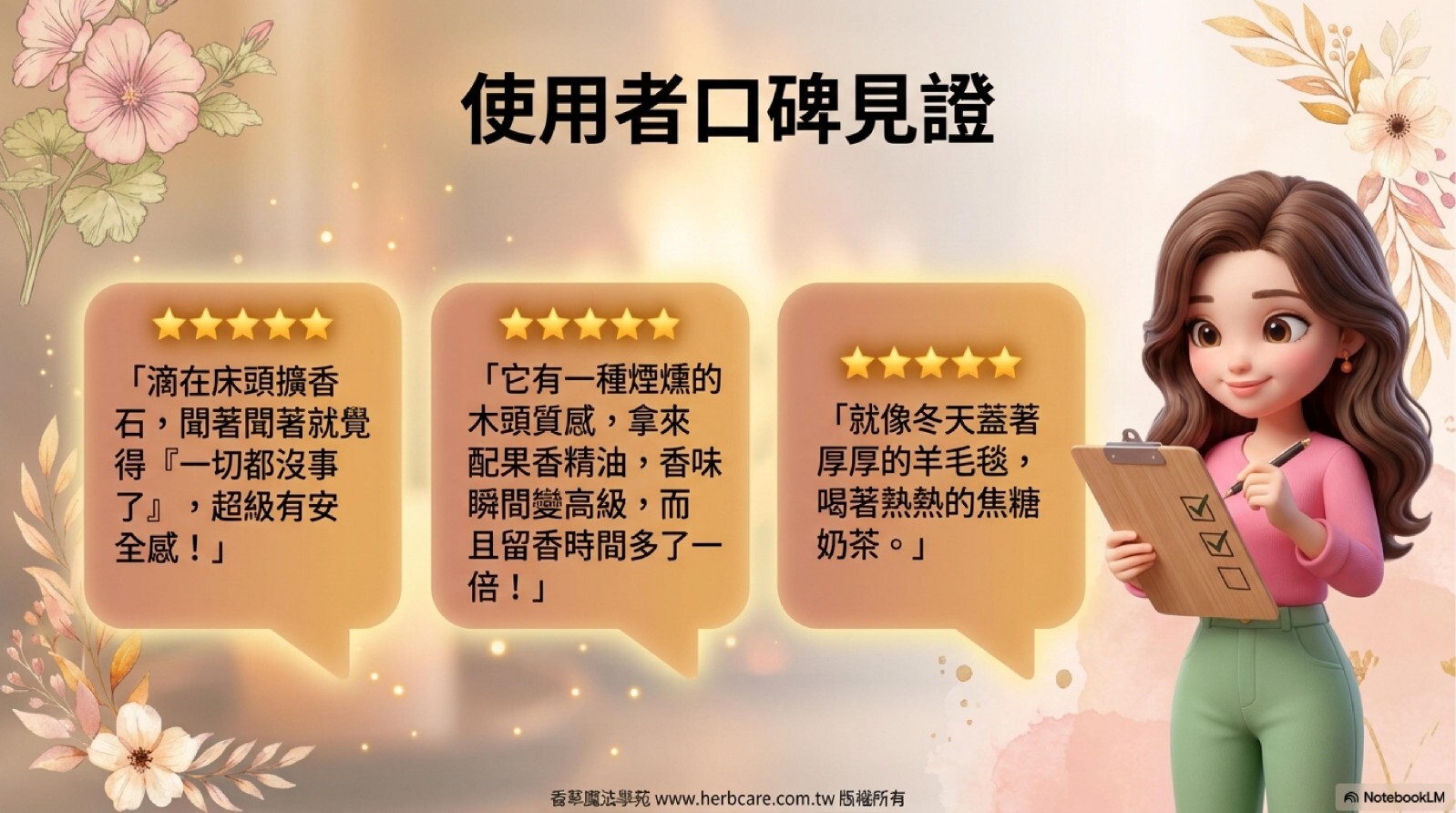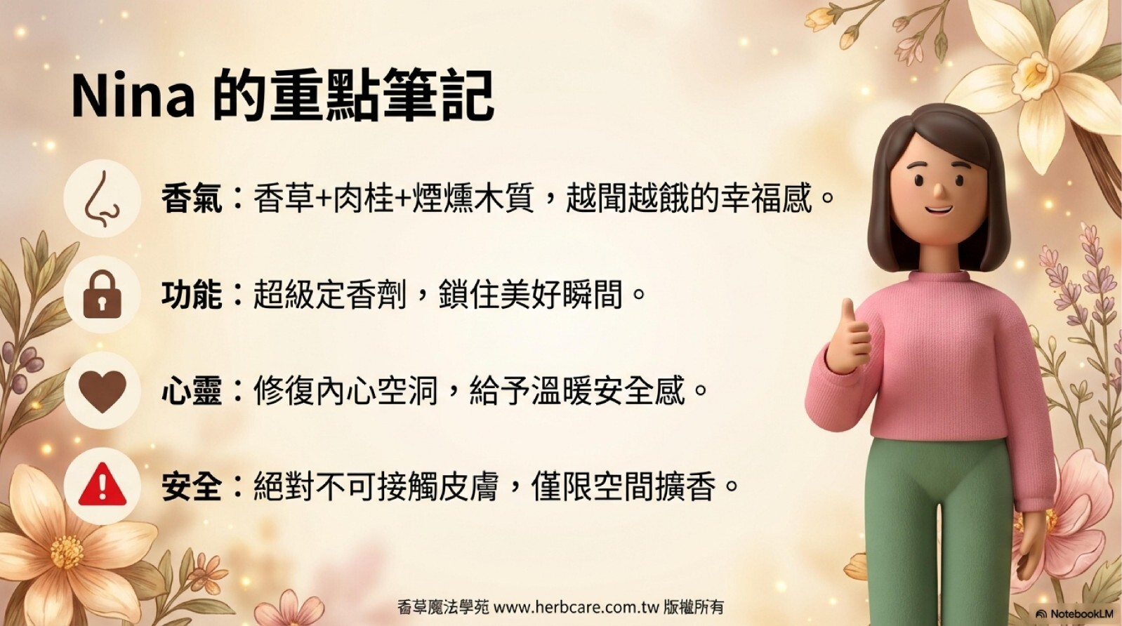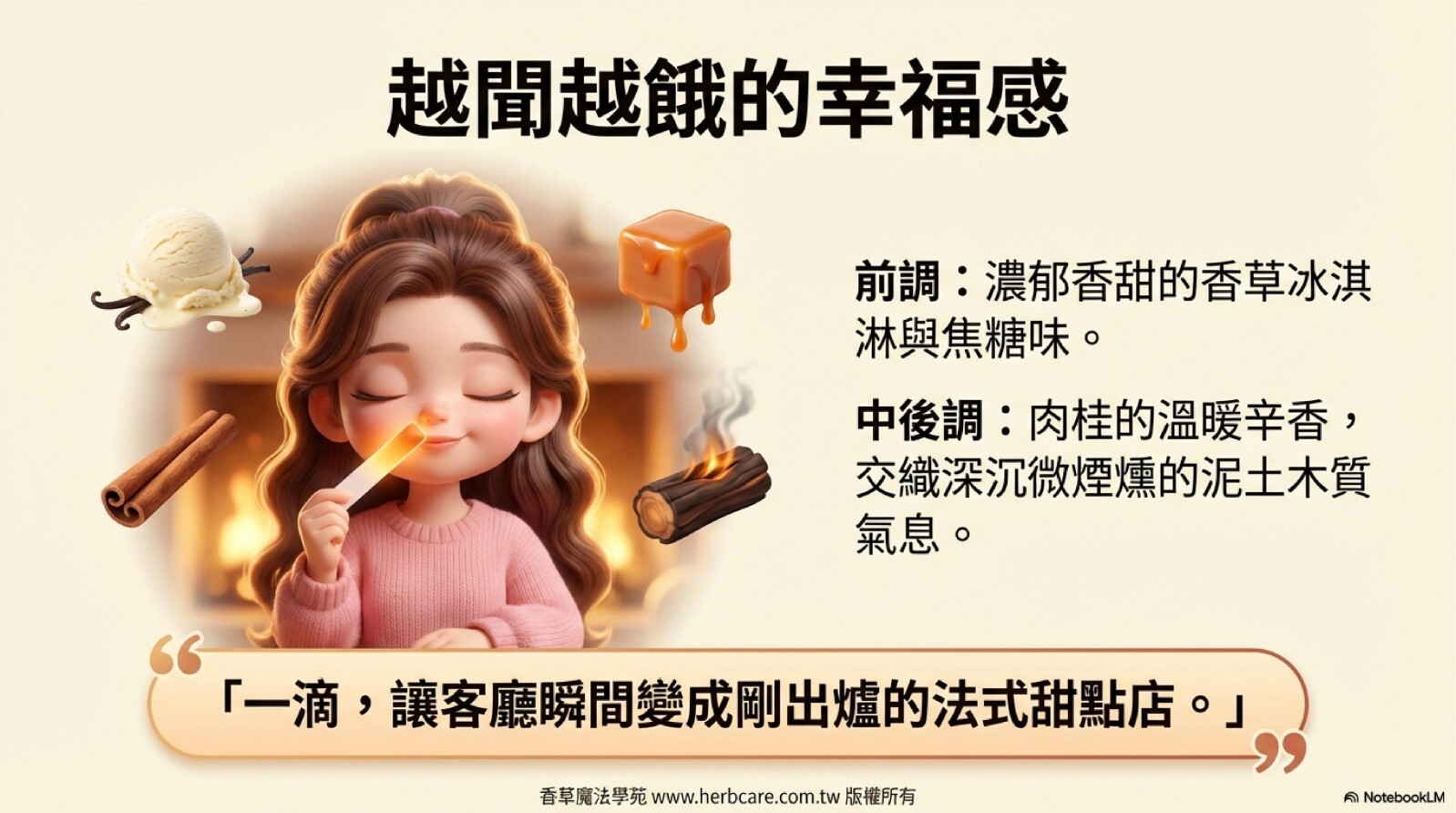 | Vanillin (香草醛) | 微量 | 雖然含量不多,卻貢獻了標誌性的「香草奶油味」,讓人感到愉悅與放鬆。 |