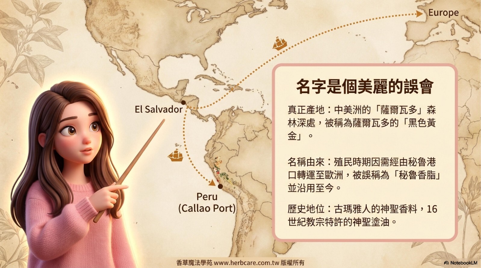 「祕魯香脂」其實產自中美洲的薩爾瓦多。但在殖民時期,薩爾瓦多沒有適合的大港口,這種珍貴的樹脂必須先運到祕魯的卡亞俄港(Callao),再轉運回西班牙。歐洲人只看發貨單是從祕魯來的,就一直叫它「祕魯香脂」直到今天。這可是芳療界最著名的「張冠李戴」故事喔!