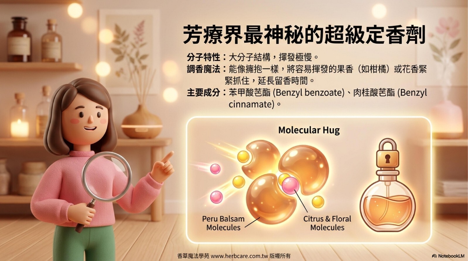 祕魯香脂的化學組成非常複雜且分子量大,這也是它為何能成為優秀「定香劑(Fixative)」的原因,能讓香氣持久不散。