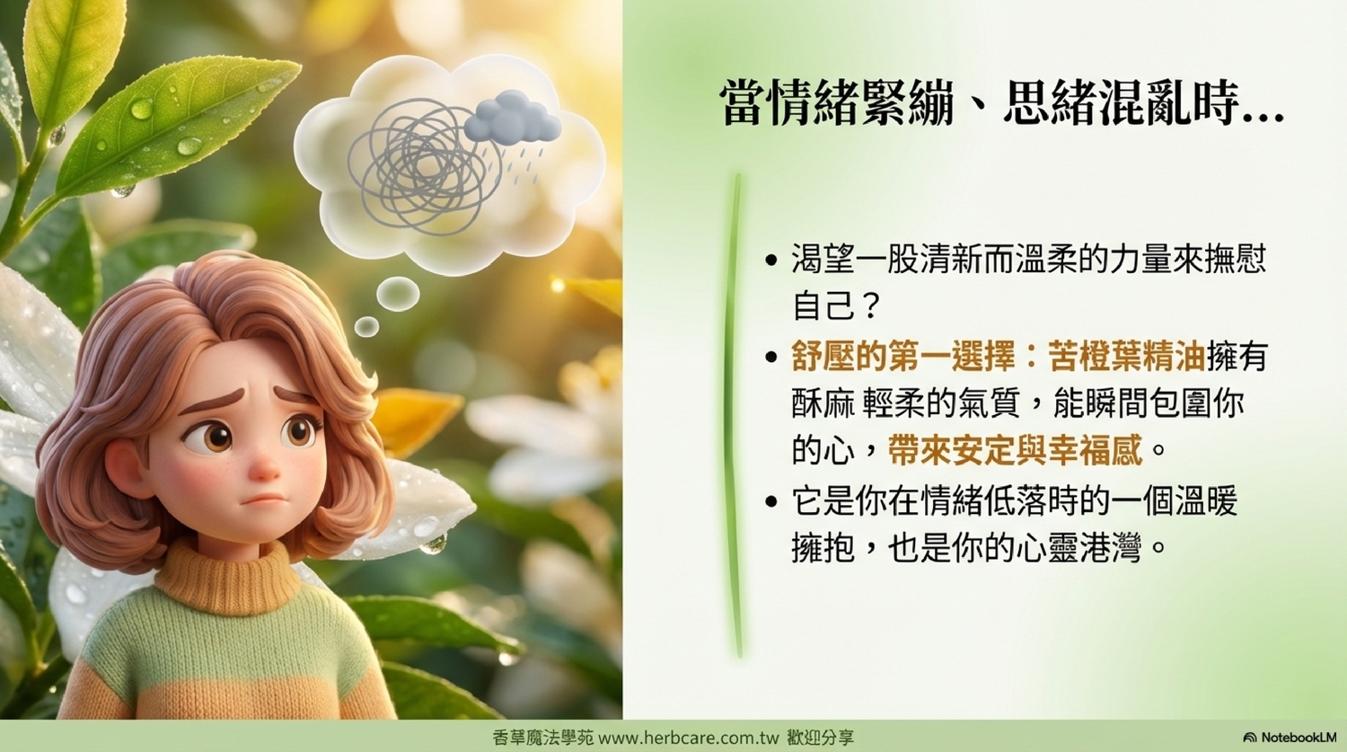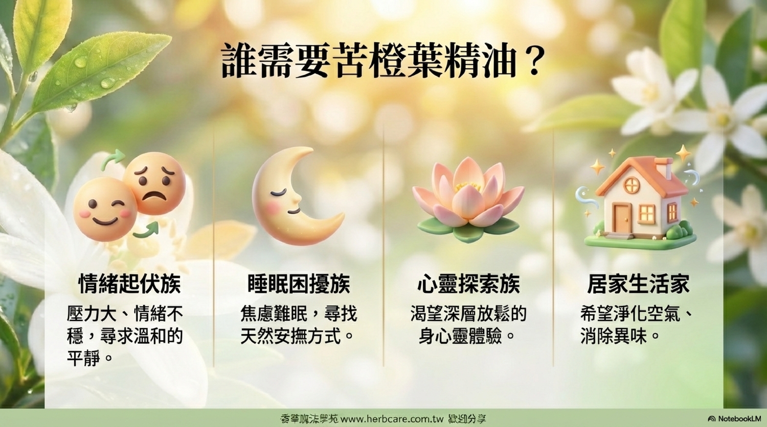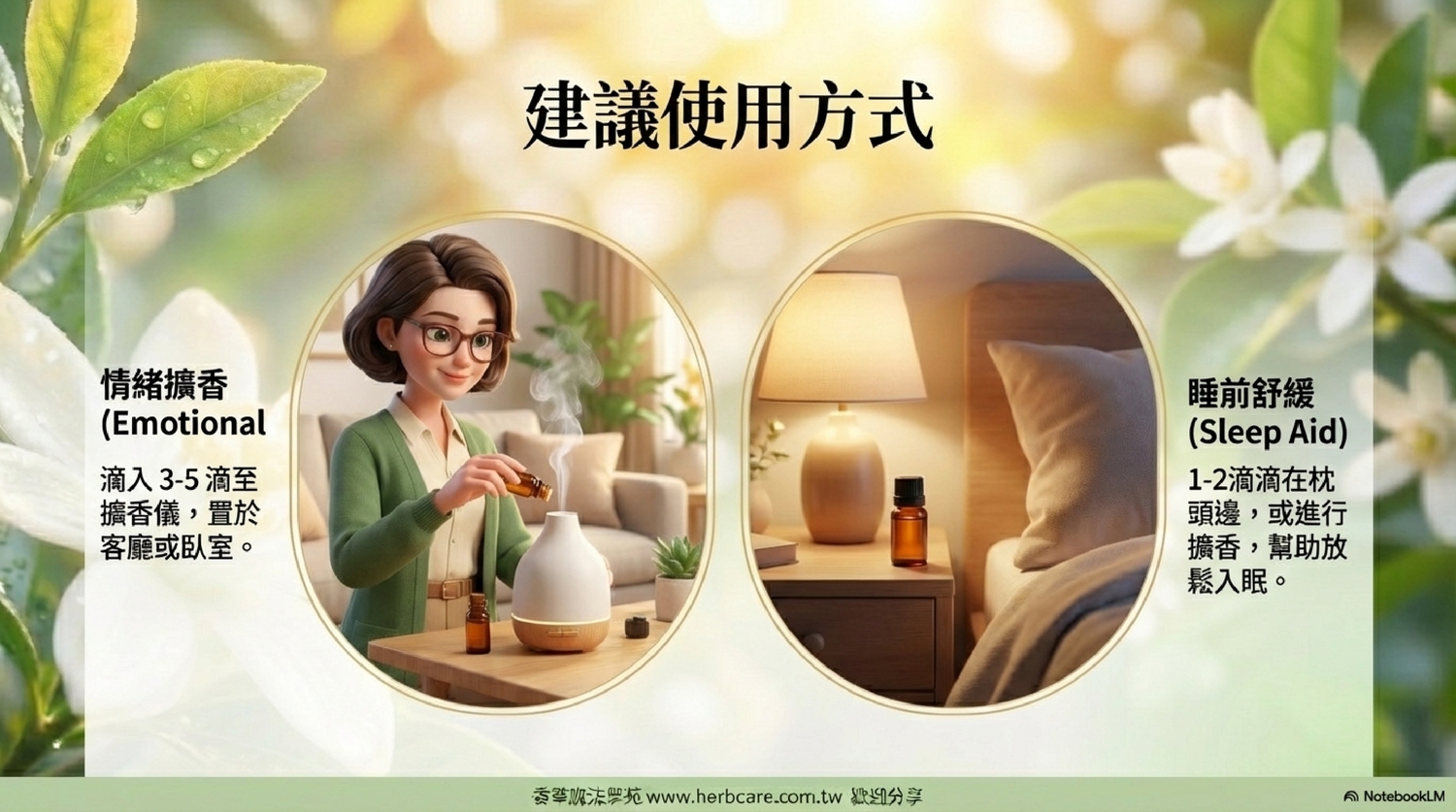 | A2: 沒錯!苦橙葉精油的香氣具有溫和的安撫、鎮靜作用,能幫助你舒緩焦慮、緊張的情緒,進而營造一個適合入睡的環境。你可以在睡前用它來擴香或進行輕柔的按摩,幫助你放鬆身心,更容易進入夢鄉。 |