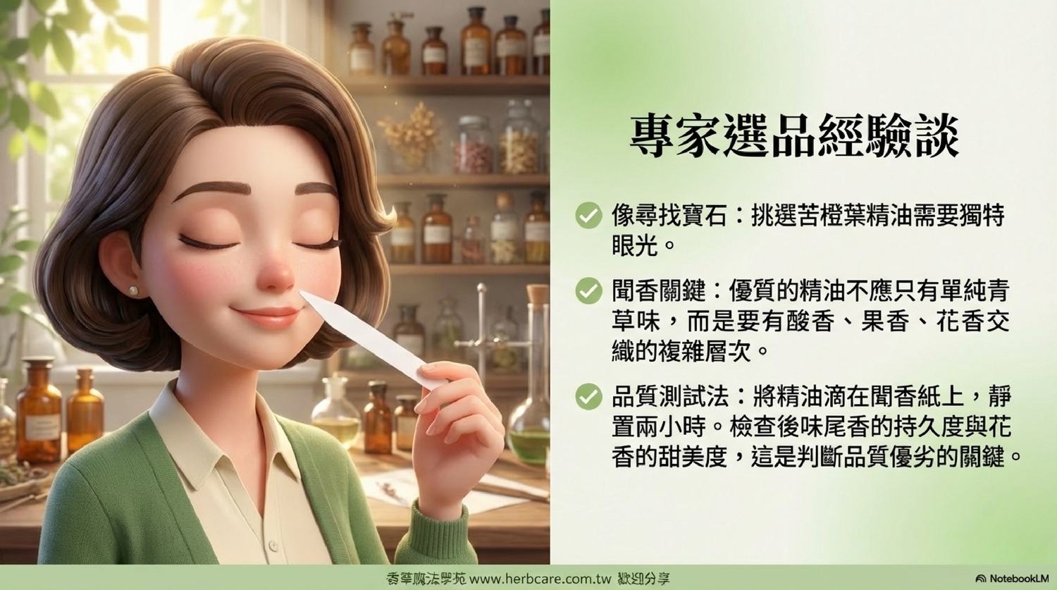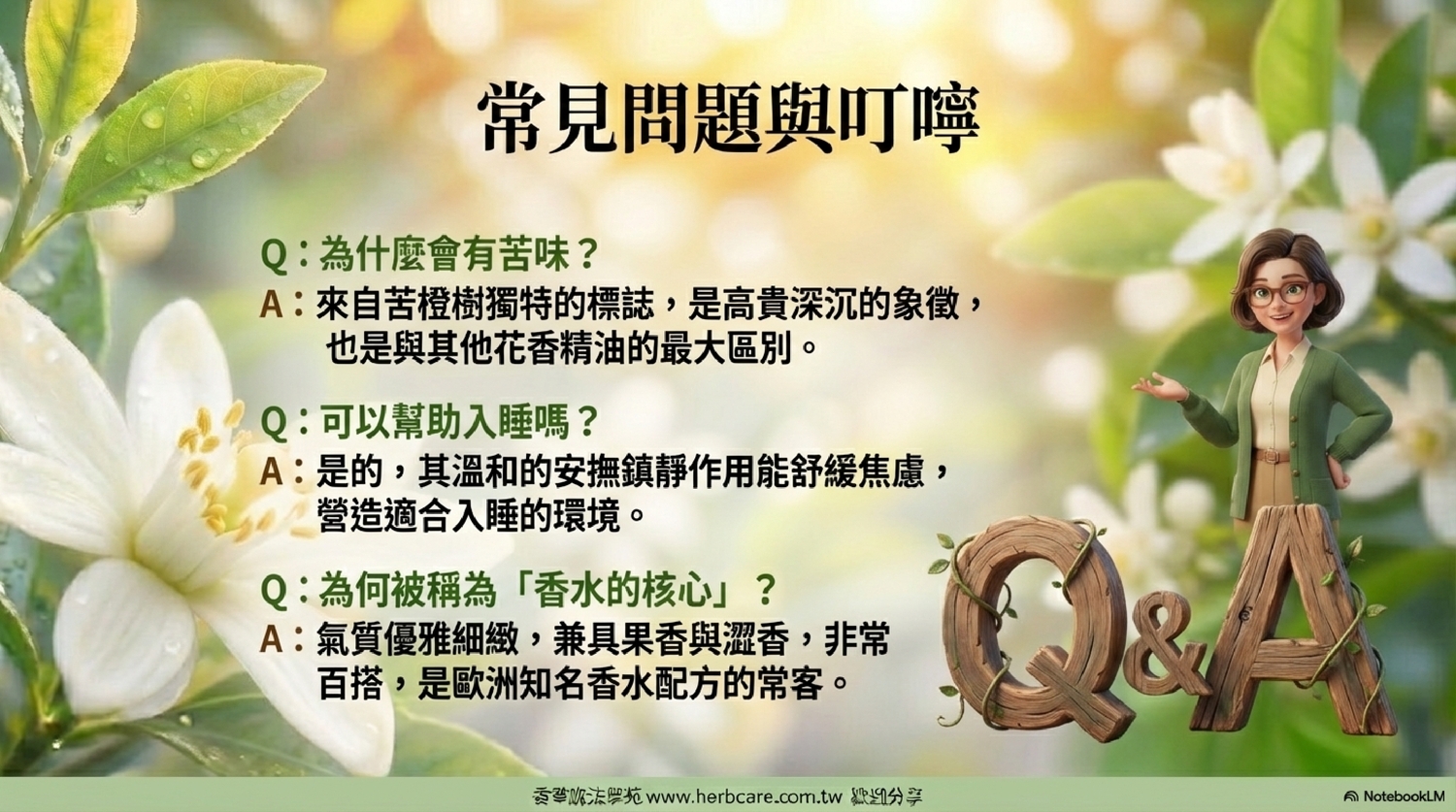 | Q1: 苦橙葉精油聞起來為什麼會有帶點苦味的青草香? |