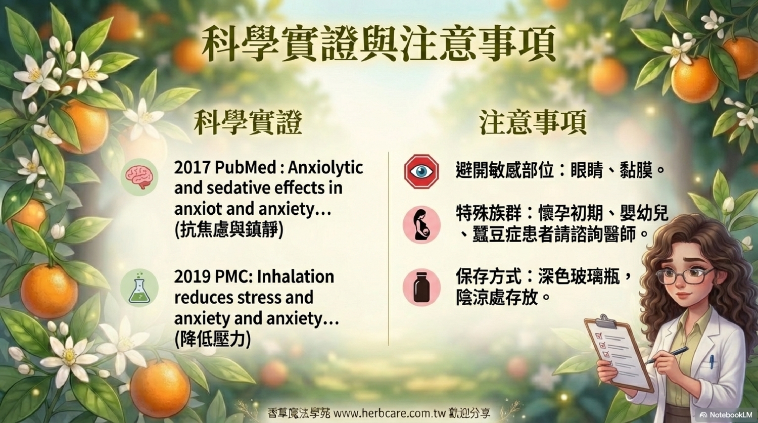 苦橙葉精油的舒緩、安撫等作用,在醫學與科學研究領域有廣泛探討。