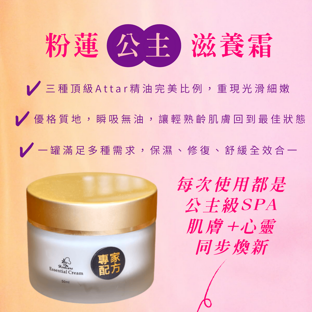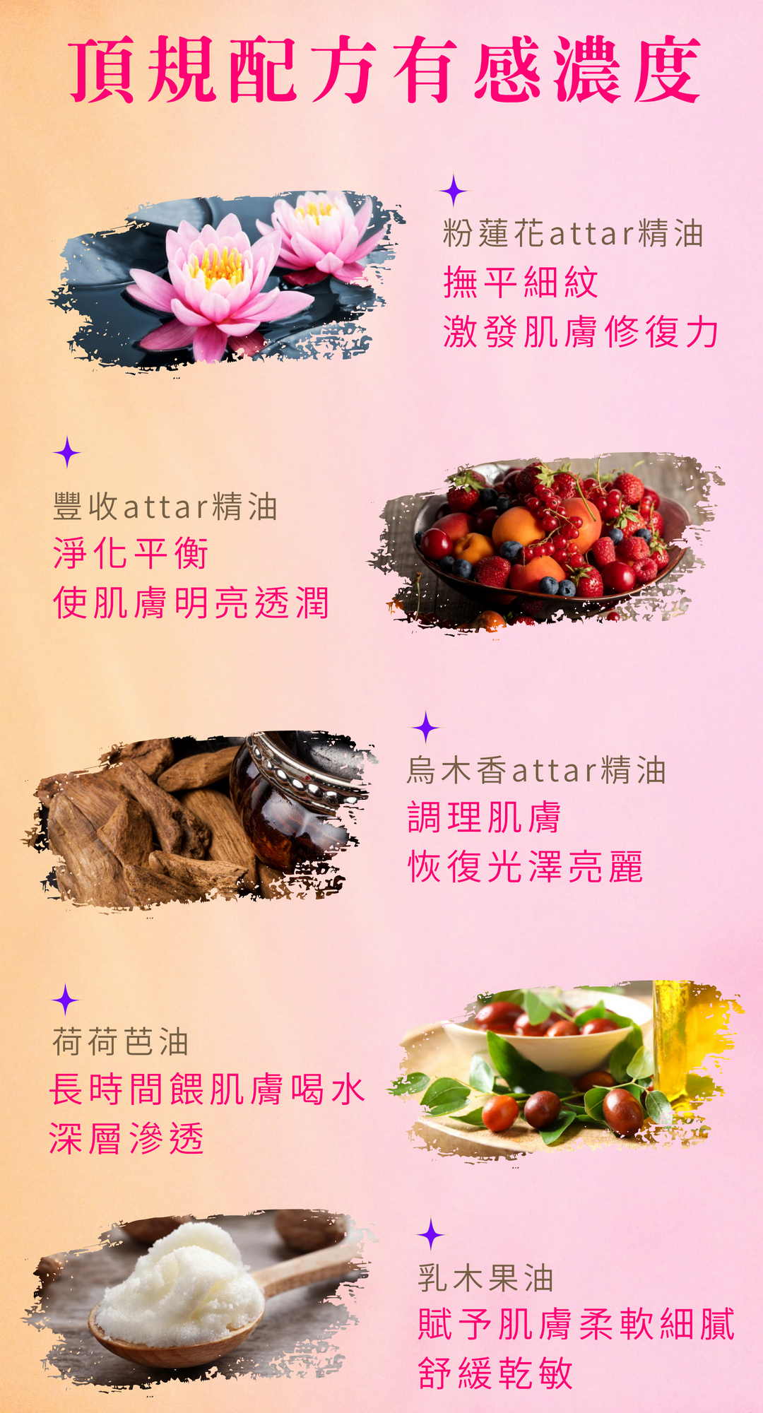 不僅僅是一瓶乳霜,更是專屬妳的蓮花公主專屬儀式,三種頂級Attar精油珍稀成分以完美比例調和,粉蓮花精油、豐收精油與烏木香精油,溫柔呵護每一寸肌膚,從早到晚,鎖住柔嫩,每一滴都凝聚大自然的溫柔與奢華,像是肌膚的隱形皇冠,滋養修復,豐盈的保濕力直達深層,修護乾燥、提亮膚色,保養後的肌膚宛如蓮花綻放般,喚醒妳的公主光采!