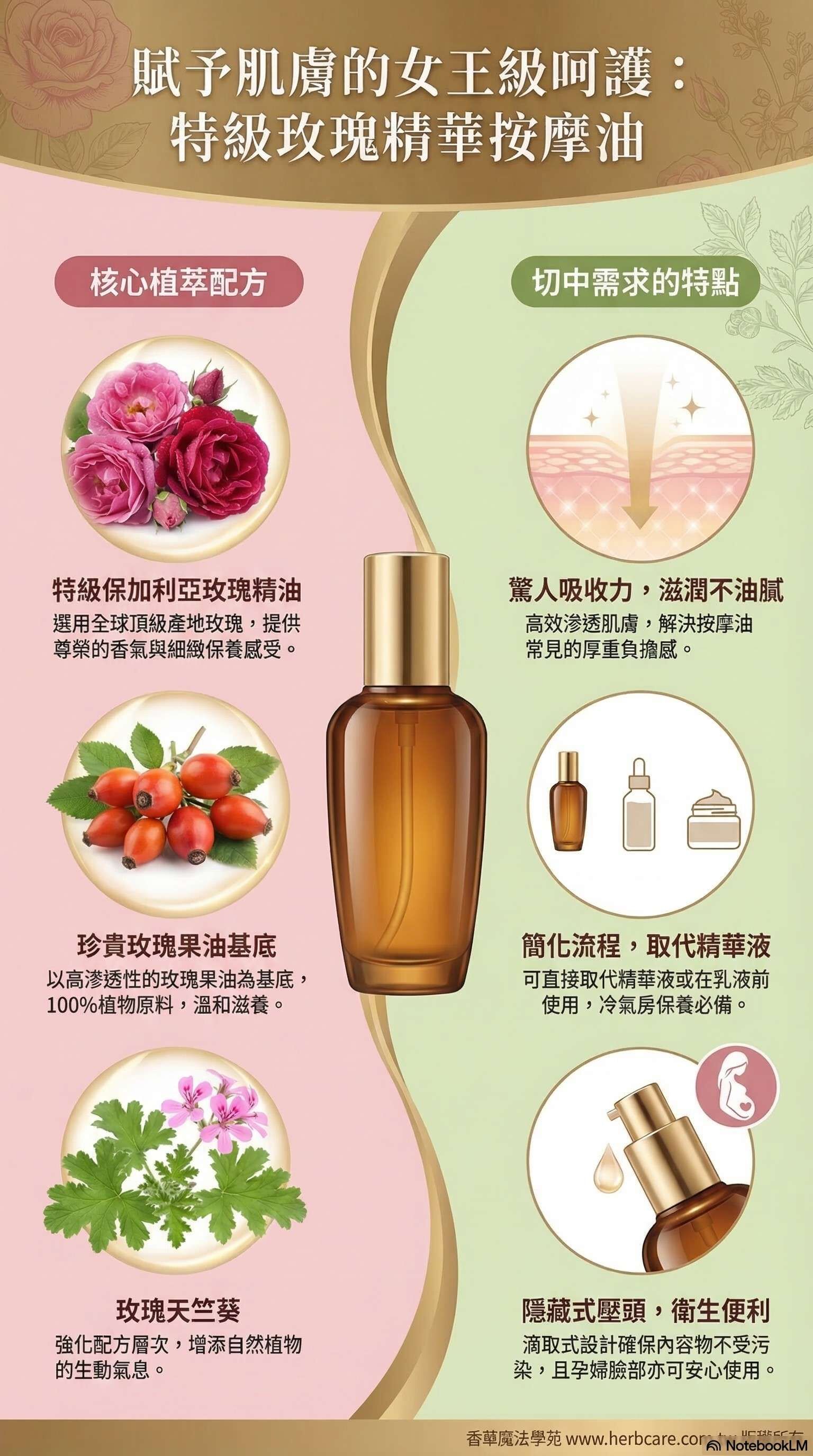 芳療顧問私心推薦!特級玫瑰精華按摩油,採用特級保加利亞精選玫瑰精油,並以珍貴之玫瑰果油做為基底油,100%都是最優質珍貴的植物材料配方,滋潤不油膩,感受驚人吸收力。採方便滴取設計,推薦在乳液前先使用,或直接取代精華液,亦適合用在臉部及身體各部位,作為細緻保養、提供尊享感受。建議每日早晚清潔後,各用一次,換季及冷氣房更宜重視使用。