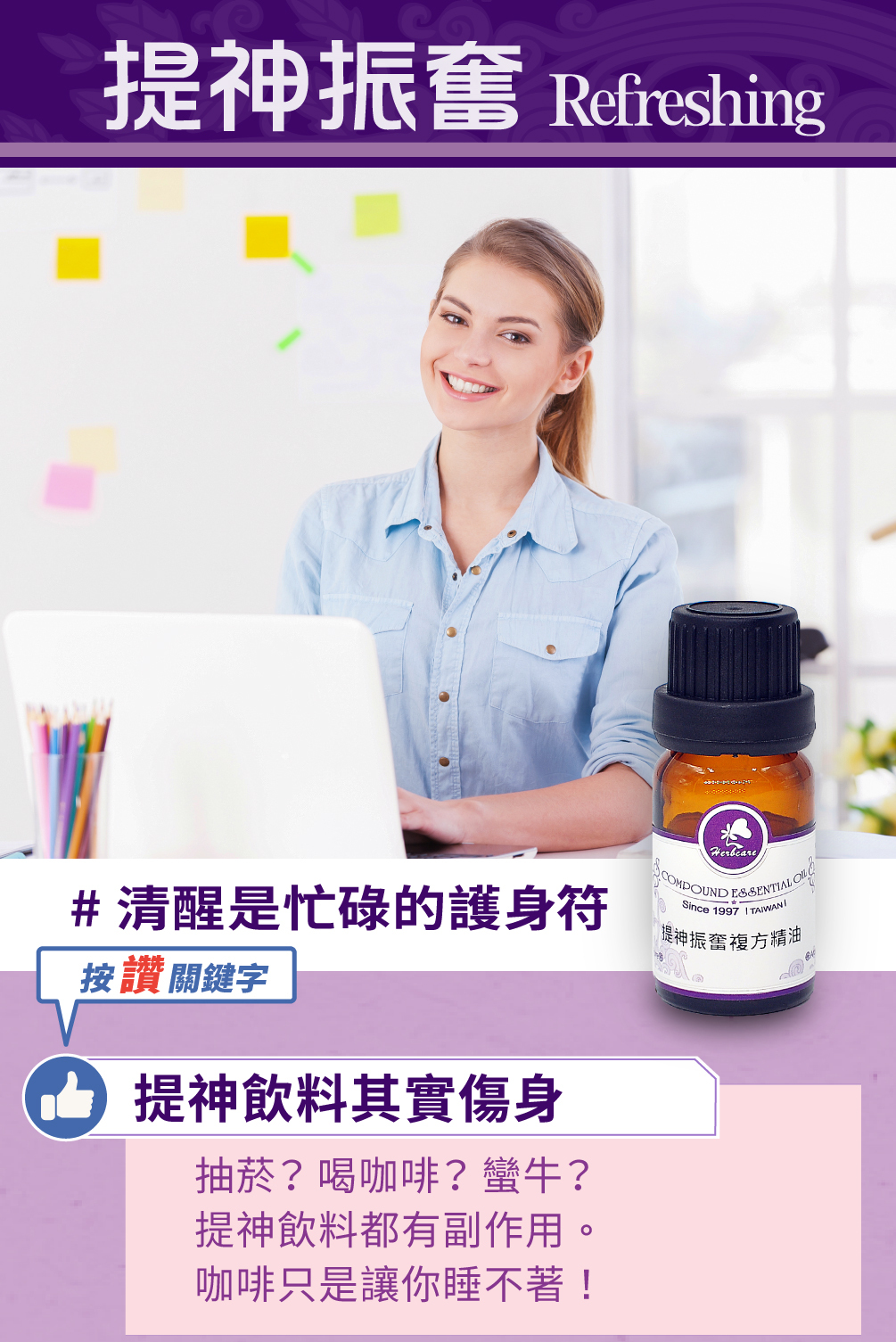 提神振奮複方精油,由冷杉精油,薄荷精油,迷迭香精油、尤加利精油等數種清涼提振類純精油,提供您更振奮更有效率的好精神(也可以滴在口罩上喔!) 冷杉精油氣味為相當甜美乾淨的木味,薄荷精油具有穿透力與草香味更是清涼有勁,迷迭香精油具穿透性的草本氣味、尤加利精油氣味新清穿透,可給人精神為之一振!提神振奮複方精油推薦給您!