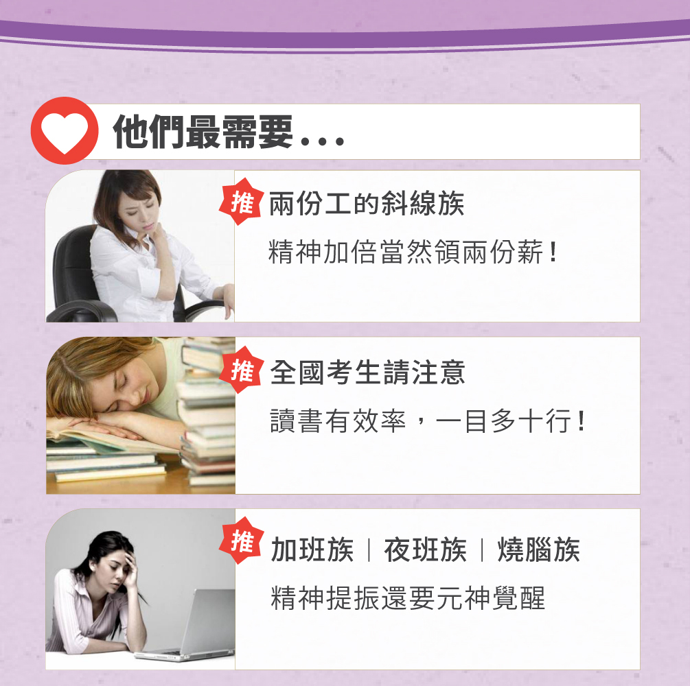 努力的人們,更需要加油,孩子讀書要專心,老公工作勞心又勞力,開車出遊要提神,在生活、工作、讀書中,處處需要提神振奮!!