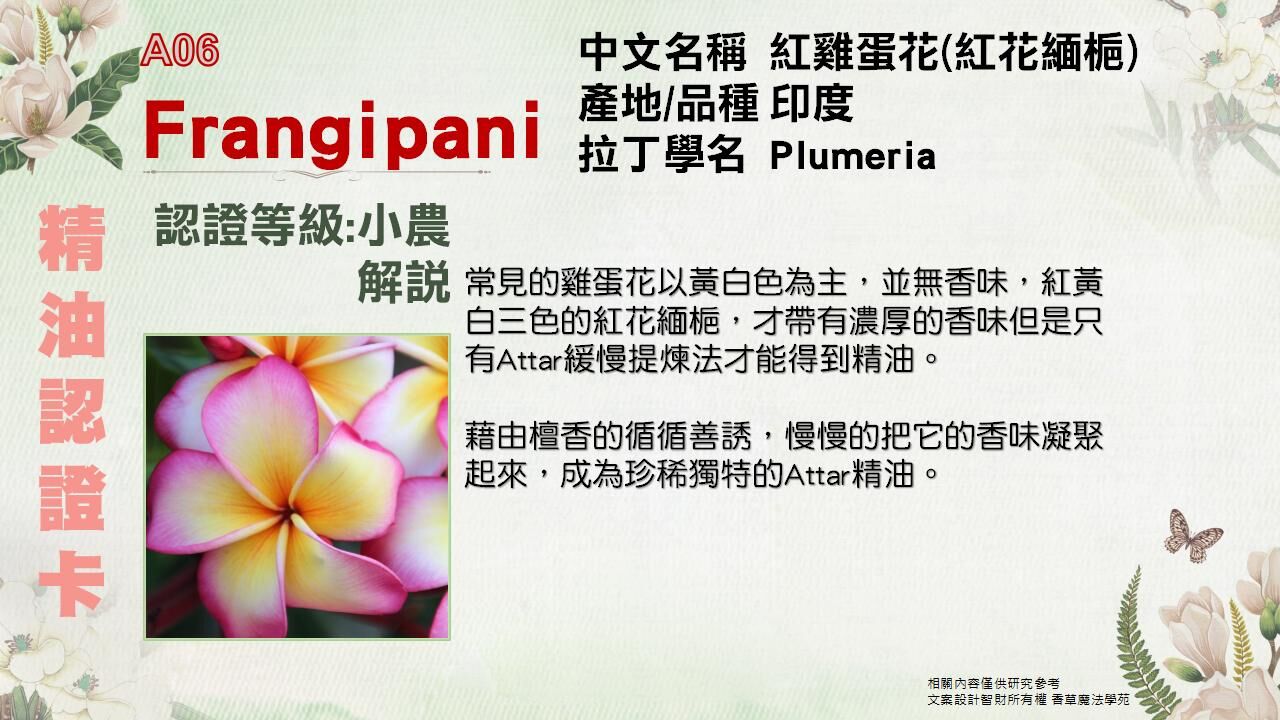 2022 年印度芳香植物研究中心發表於《Natural Product Research》的研究指出,紅花緬梔精油含有的檸檬烯與金合歡醇具備潛在抗氧化與鎮靜性。