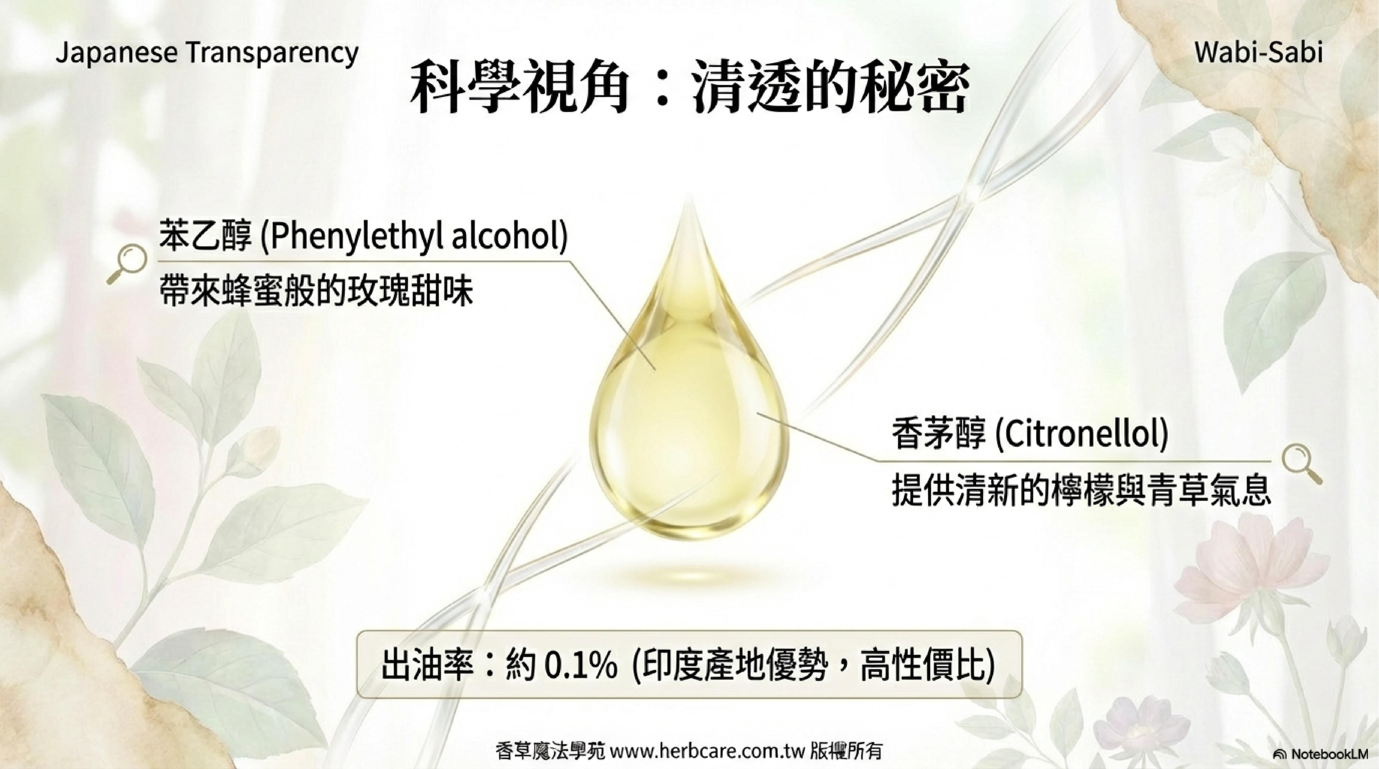 | 主成分 | 苯乙醇(55-65%)、香葉醇(15-20%)、金合歡醇 |
