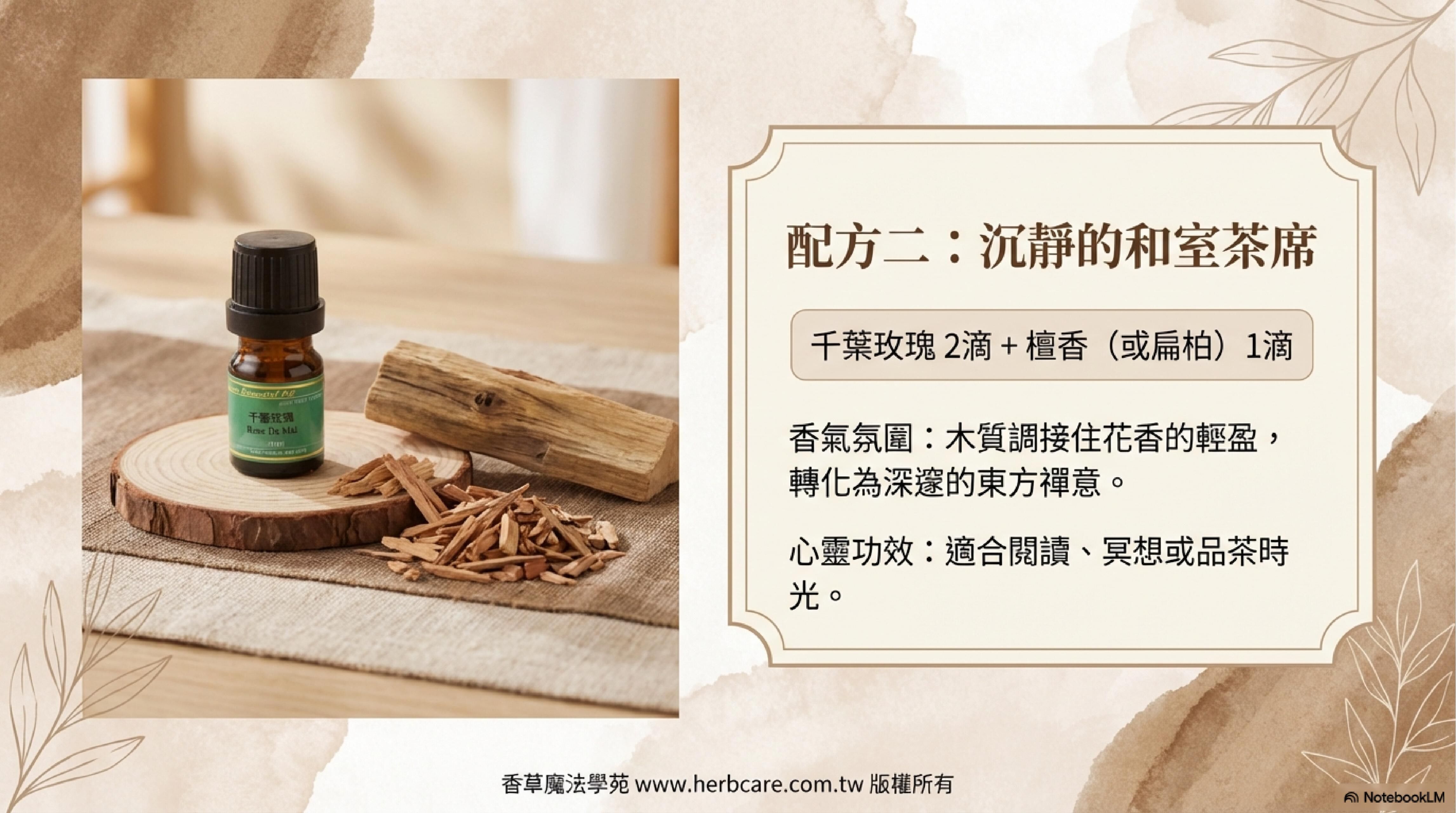 檀香精油:檀香精油與千葉玫瑰精油的組合可以營造出深沉、溫暖、木質調的香氣。這種組合有助於放鬆和平靜心靈,並提升內心的平和感。