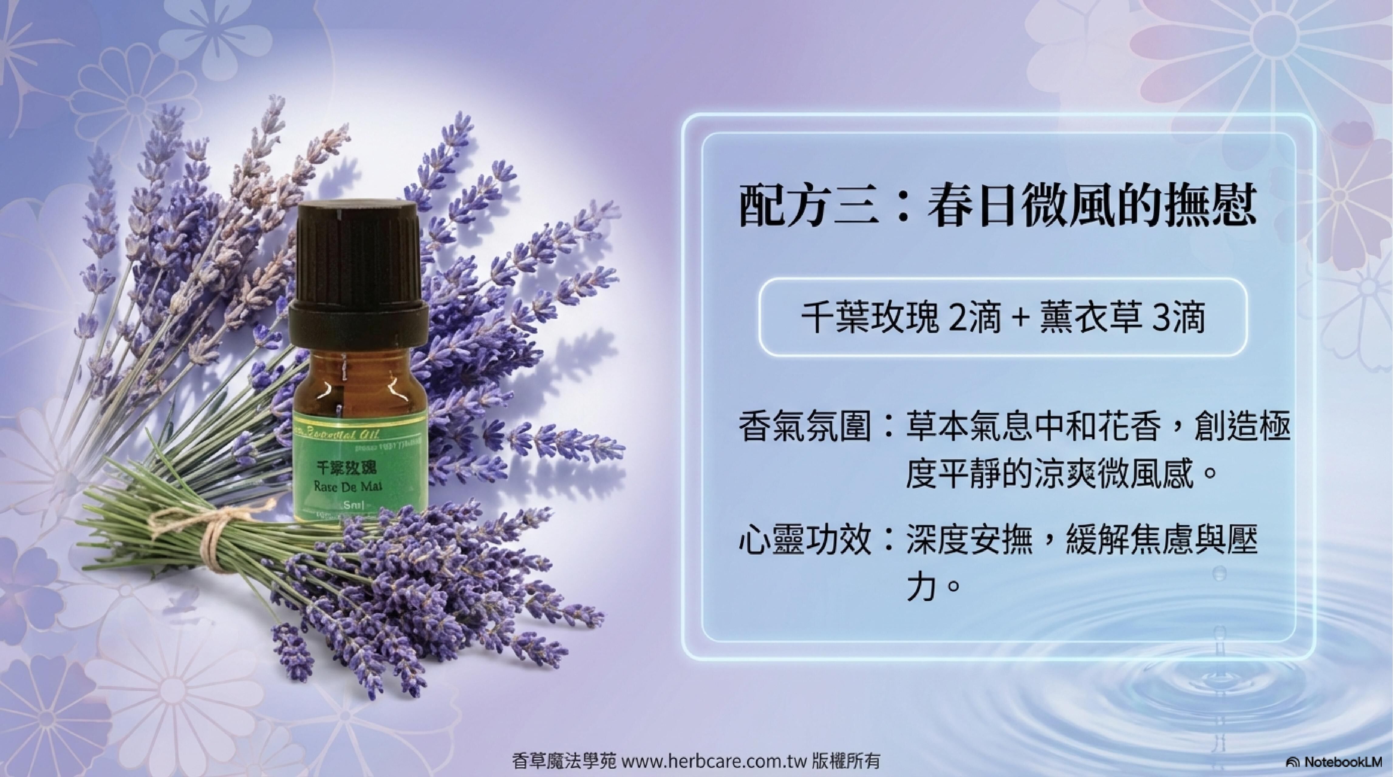 薰衣草精油:薰衣草精油與千葉玫瑰精油的組合可以創造出平靜、安撫和放鬆的香氣。這種組合對於緩解壓力、促進睡眠和平衡情緒非常有效。