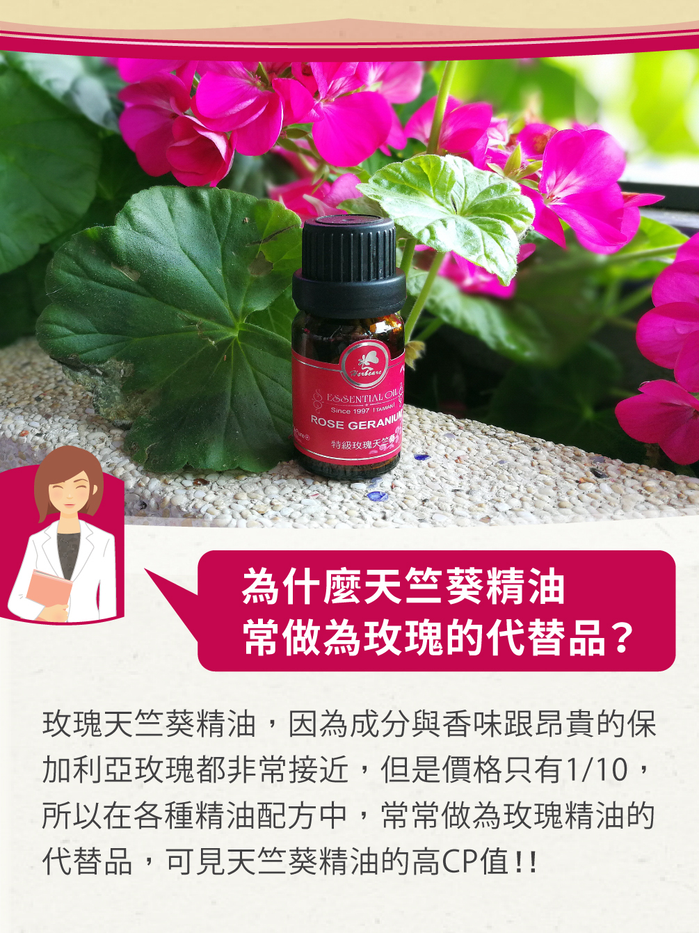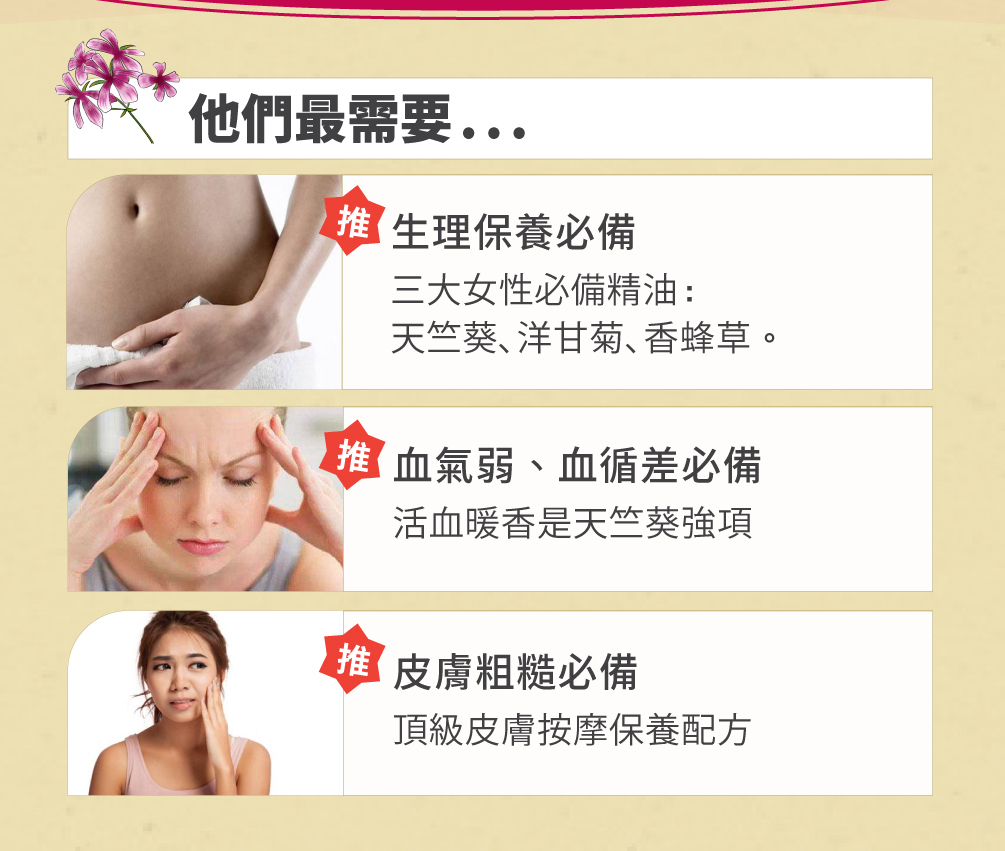 | A2: 玫瑰天竺葵精油的香氣具有平衡身心的作用,溫柔的香氣能幫助安撫煩躁、焦慮的情緒。你可以在經期前後用它來擴香,給自己一個溫柔的呵護。 | ||