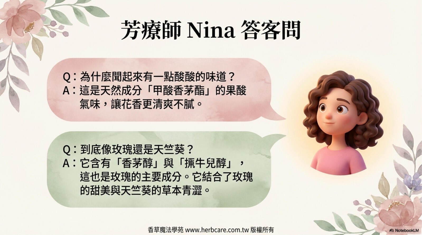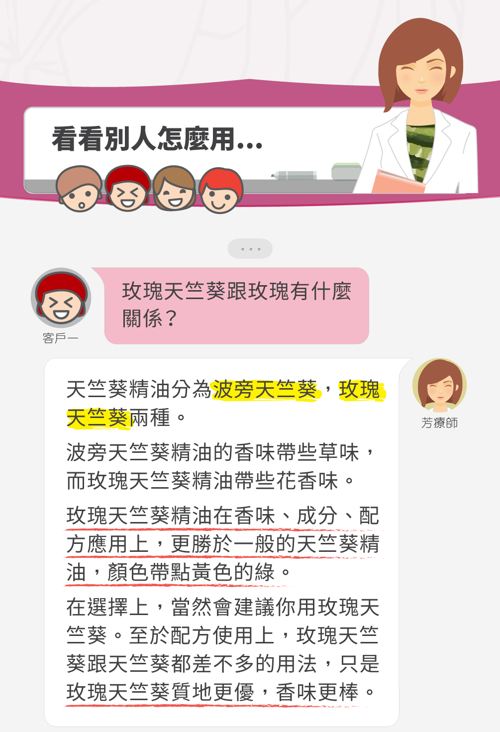 | A1: 這是因為玫瑰天竺葵精油的主要成分香茅醇與牻牛兒醇,同時也是玫瑰精油的主要成分。這讓它擁有了玫瑰般的甜美,同時也保留了天竺葵的草本青澀,兩者完美結合,創造出獨特又迷人的香氣。 | ||